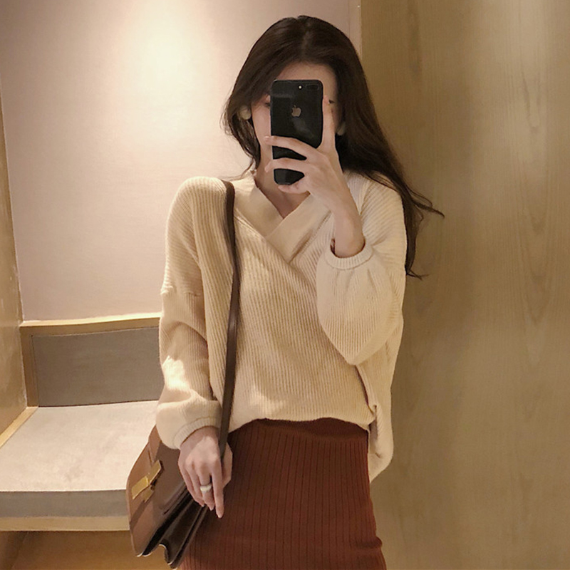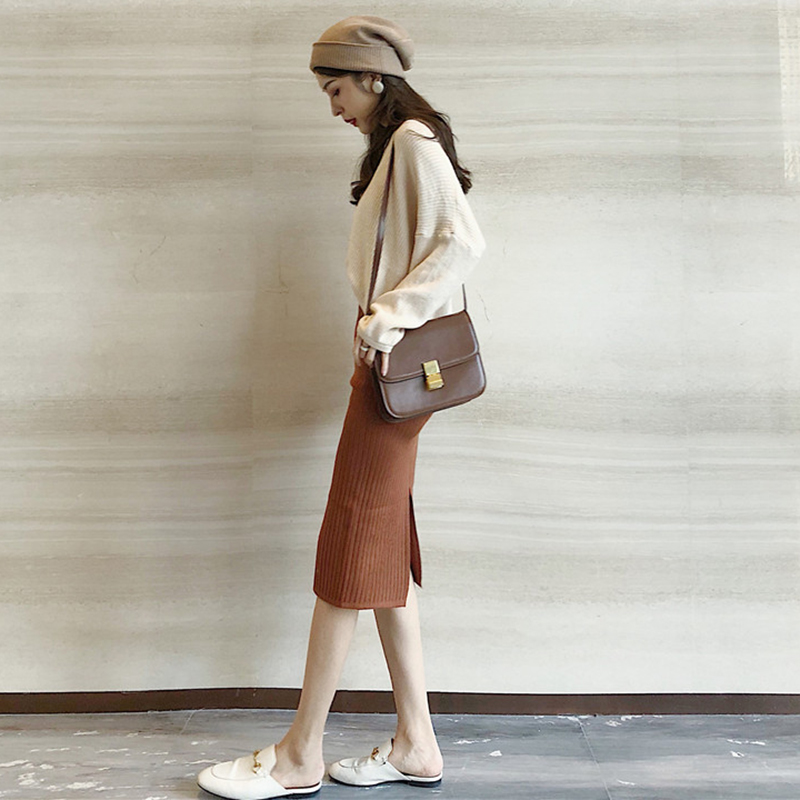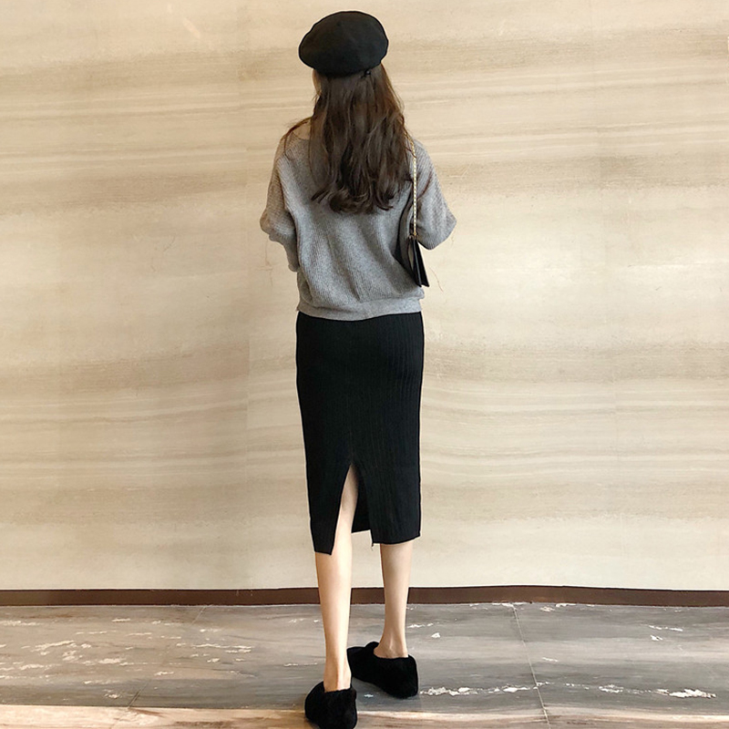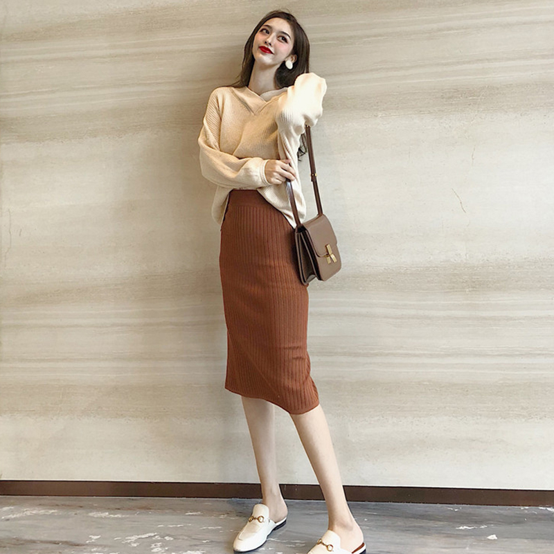/ 毛衣配裙子兩件套秋冬女新款寬松V領針織衫高腰修身開叉半身裙子