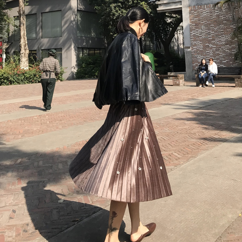 / 復古絲絨百褶大擺半身裙秋冬2018新款釘珠高腰顯瘦女A字中長裙子
