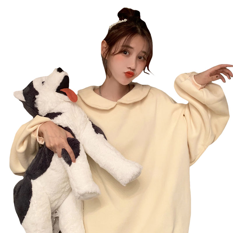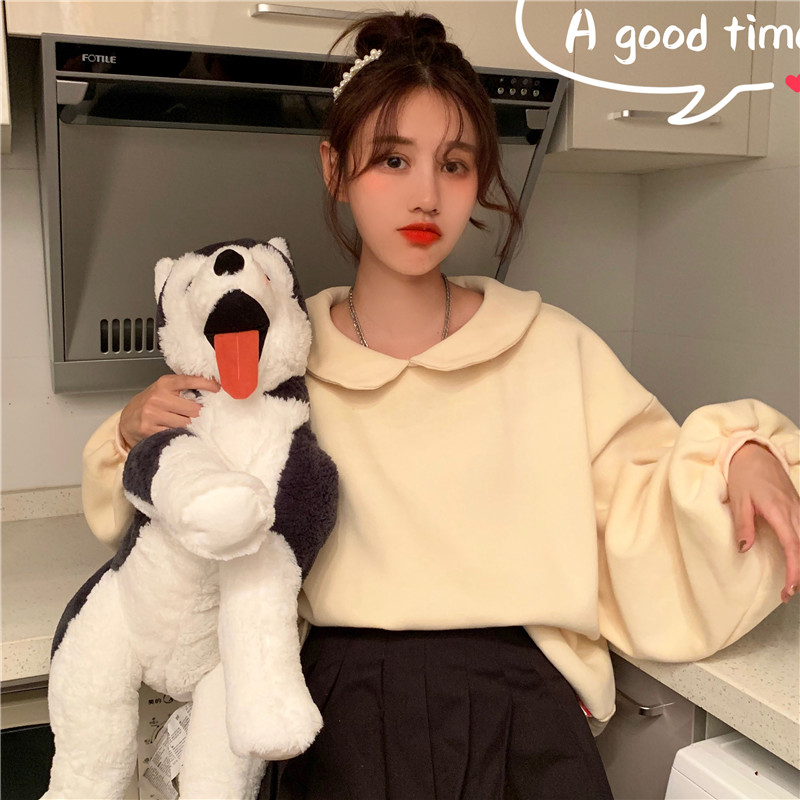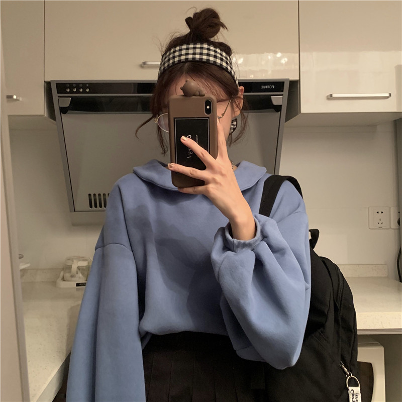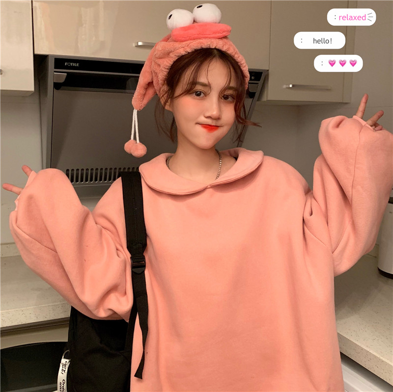 2018新款秋冬女裝韓版慵懶風純色寬松娃娃領加絨加厚衛衣上衣外套