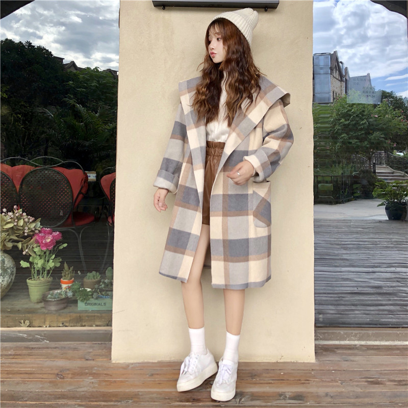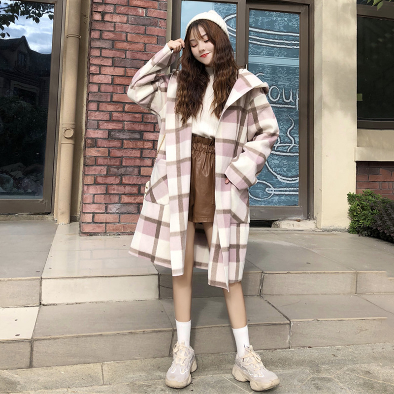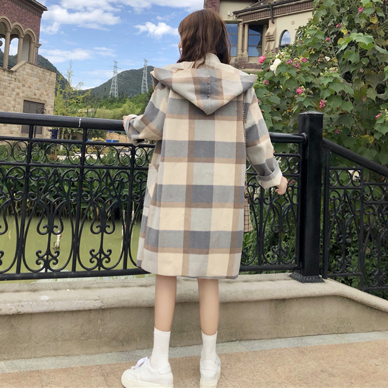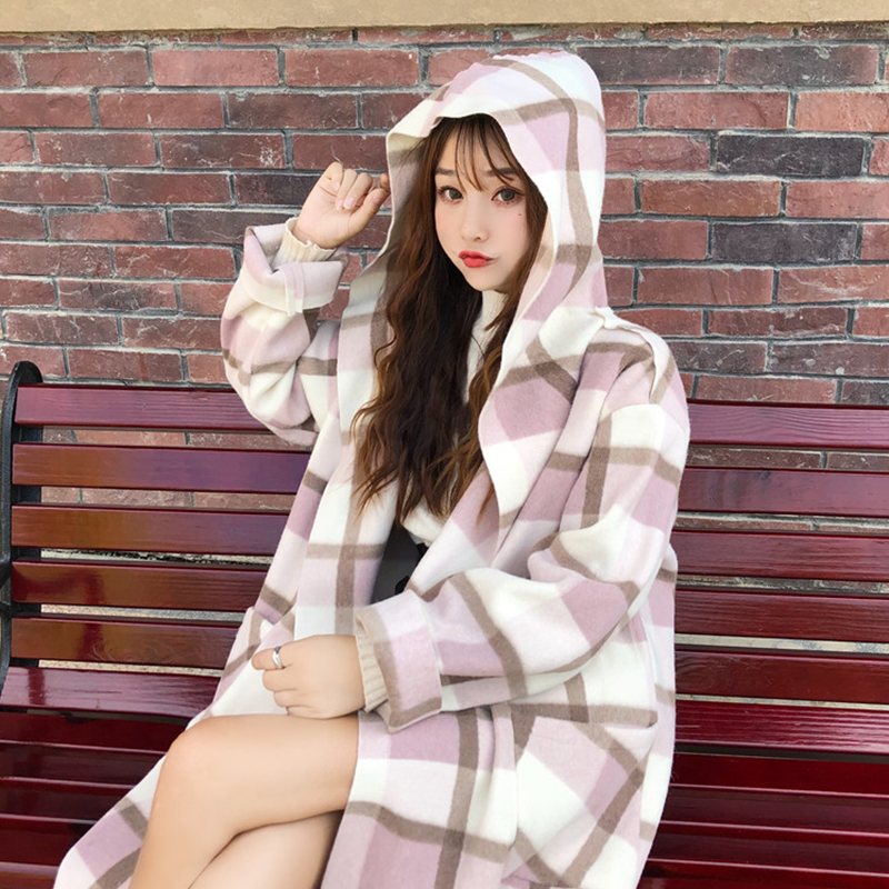 連帽大衣秋冬女裝2018流行新款學生寬松中長款雙口袋格子毛呢外套