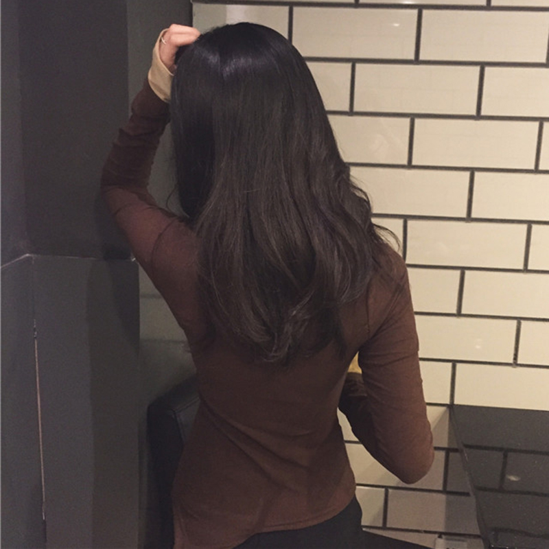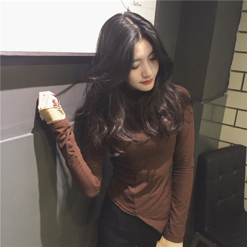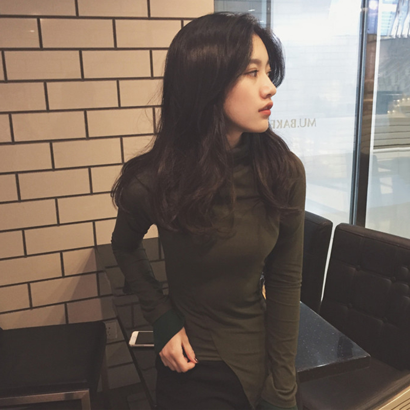 復古打底衫秋裝2018新款修身荷葉長袖T恤上衣不規則半高領體恤女