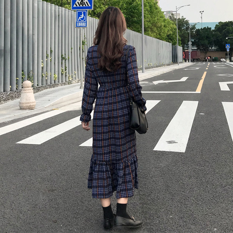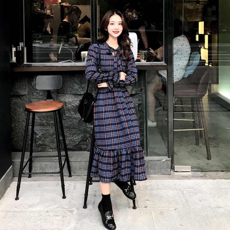 港味復古格子連衣裙女秋裝2018新款氣質長袖寬松顯瘦荷葉a字長裙
