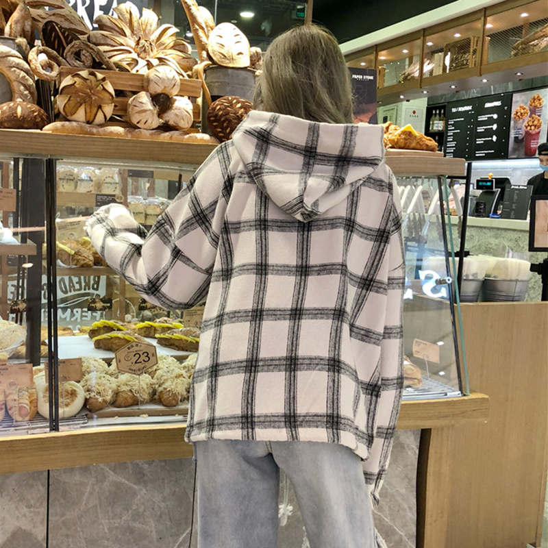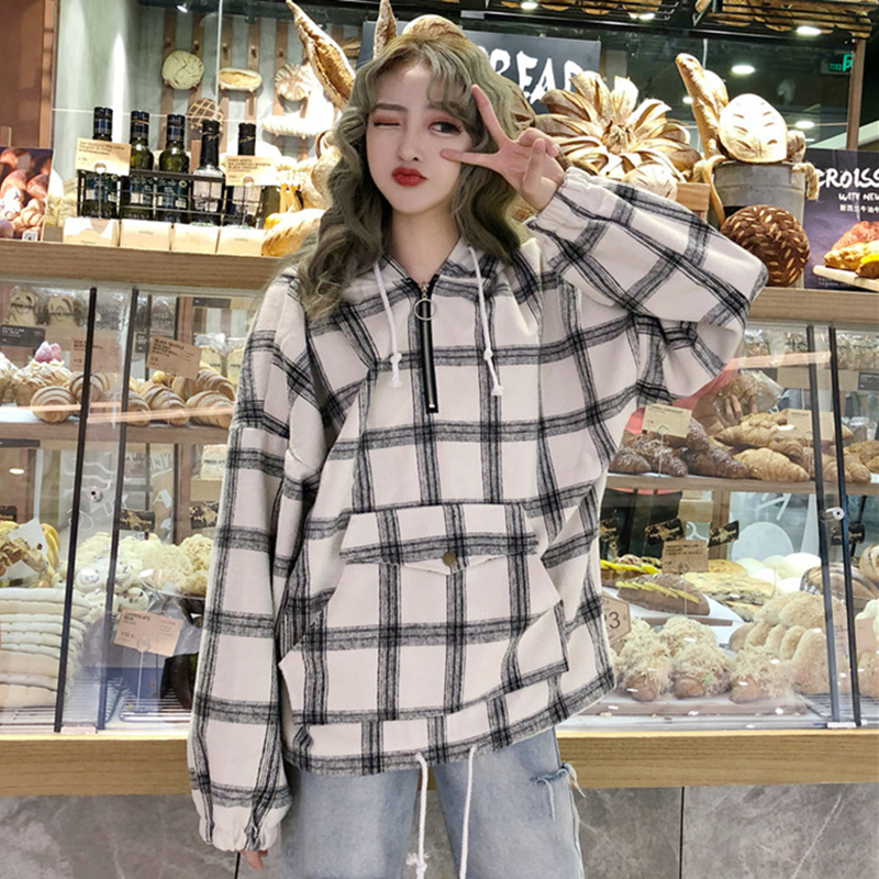 / 原宿風外套秋裝女2018新款格子寬松連帽衛衣學生口袋時尚長袖上衣