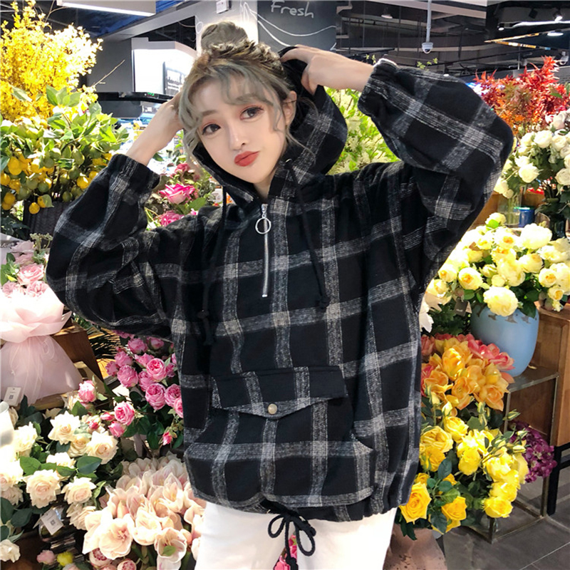 原宿風外套秋裝女2018新款格子寬松連帽衛衣學生口袋時尚長袖上衣