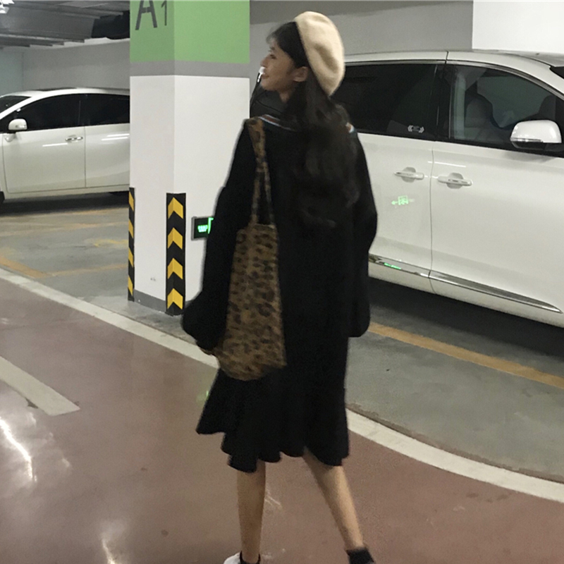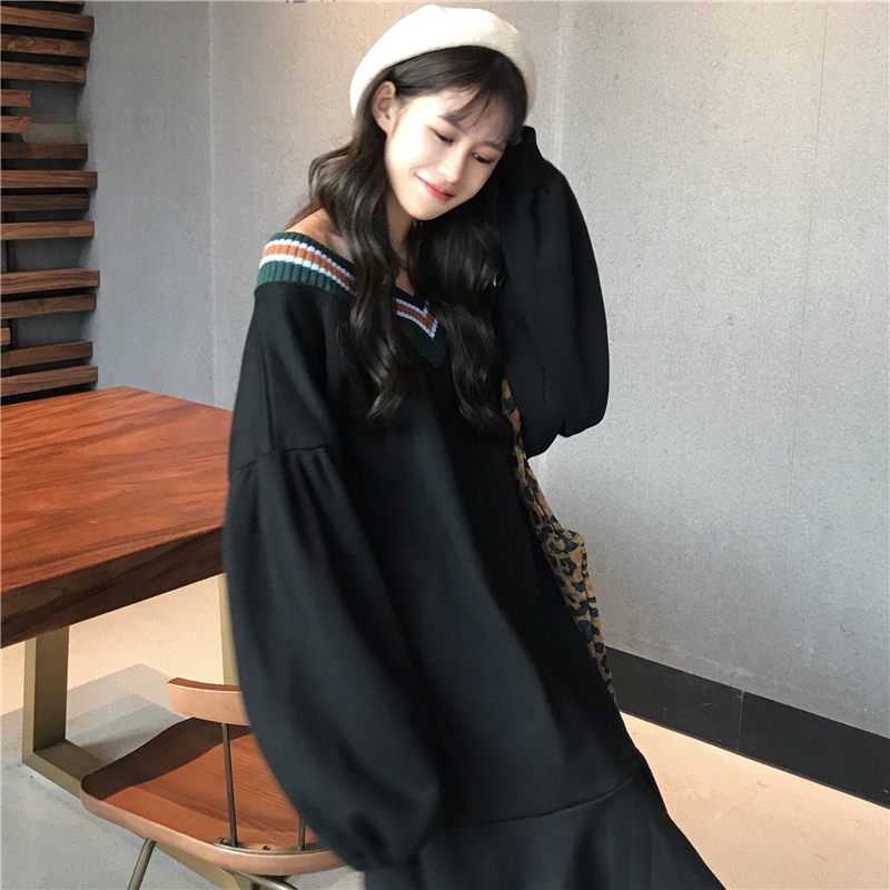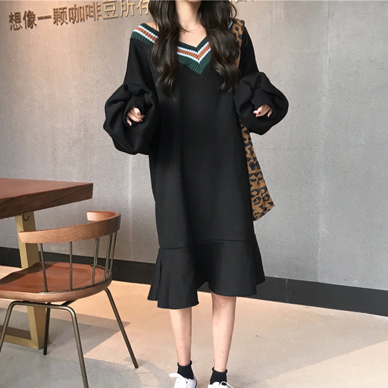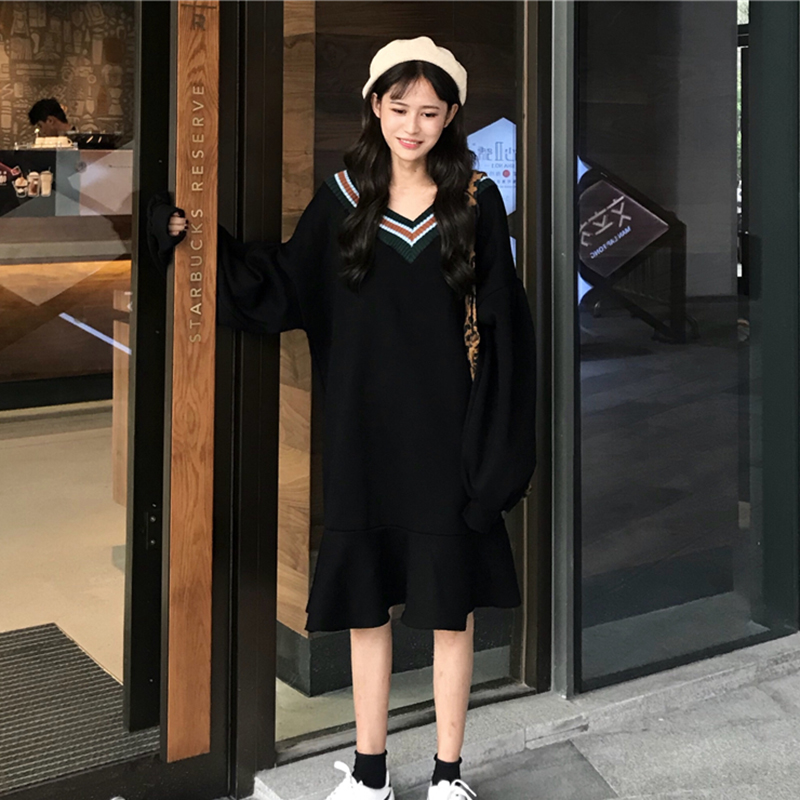 學院風加絨衛衣裙秋冬2018新款女裝拼色V領連衣裙荷葉邊中長裙子