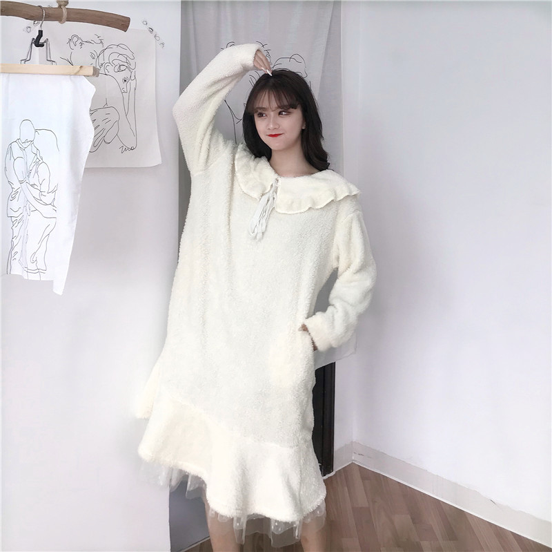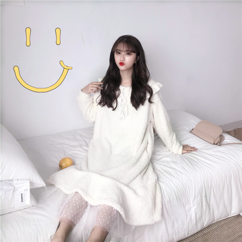 / 秋冬女裝韓版甜美可愛珊瑚絨家居服睡裙中長款寬松長袖睡衣連衣裙