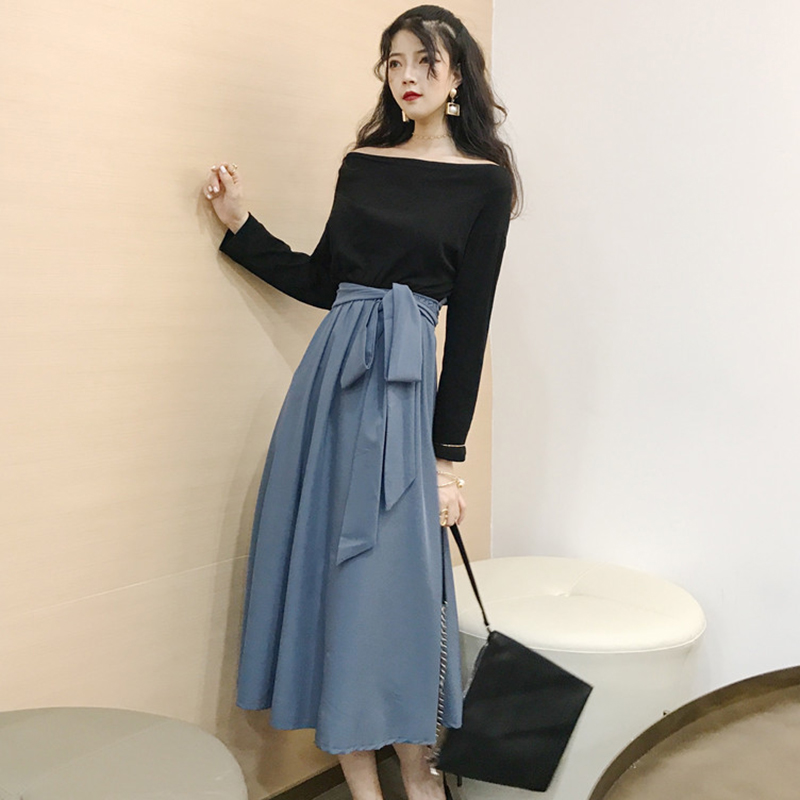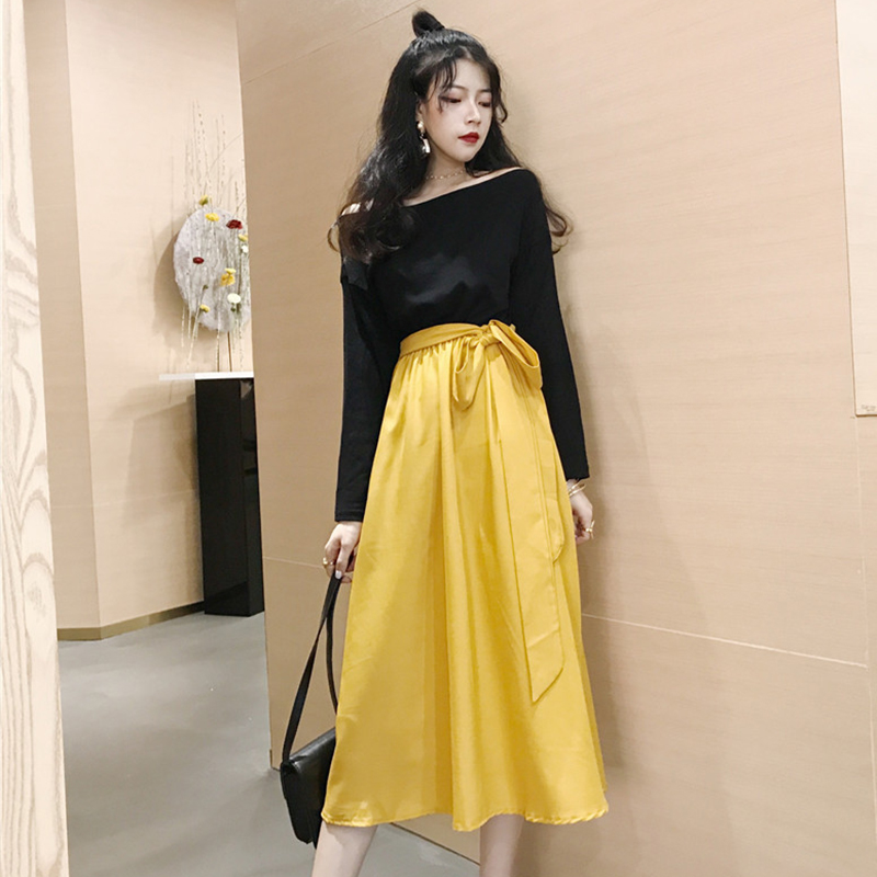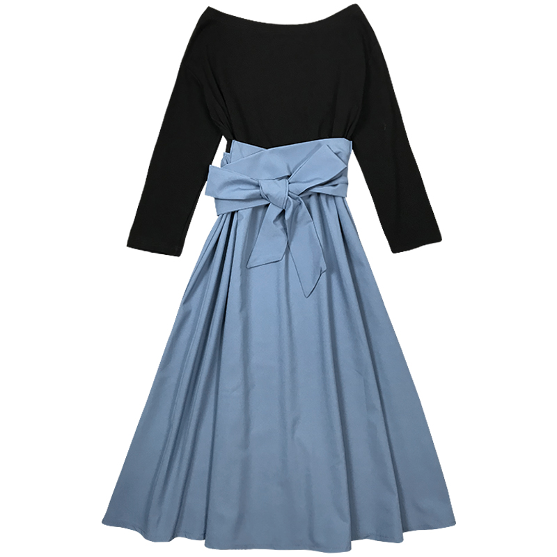 / 秋裝女新款韓范個性拼接假兩件長袖連衣裙時尚修身氣質綁帶中長裙