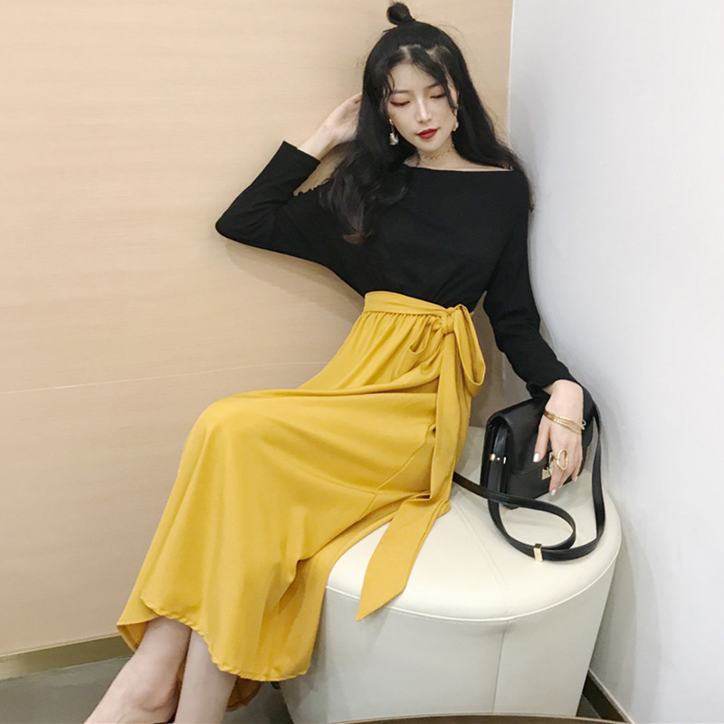 秋裝女新款韓范個性拼接假兩件長袖連衣裙時尚修身氣質綁帶中長裙