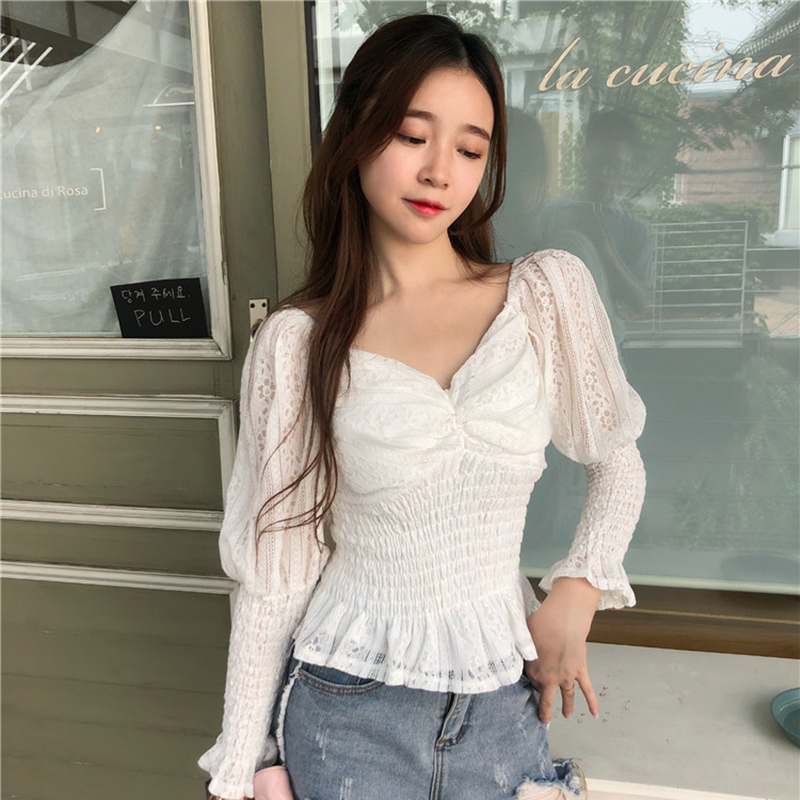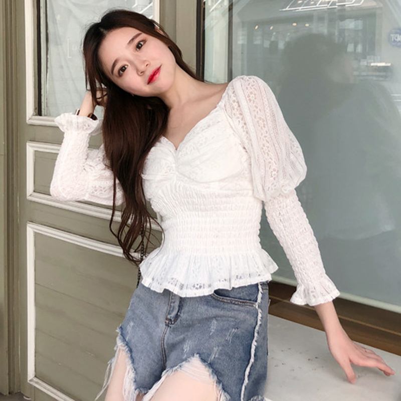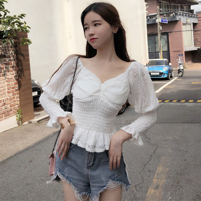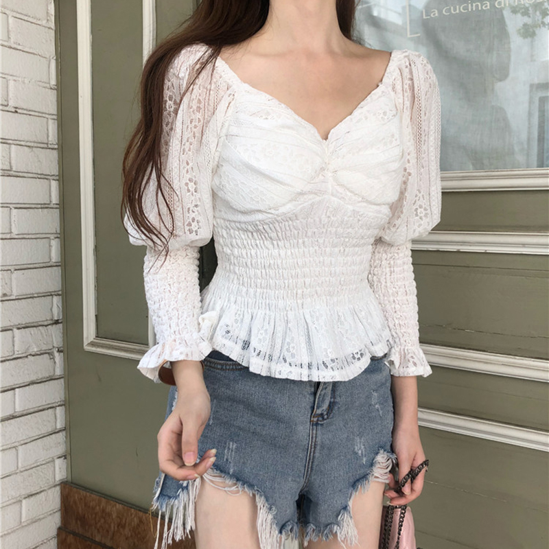 / 女秋裝新款韓版收腰鏤空短款泡泡袖雪紡襯衫氣質V領蕾絲長袖上衣