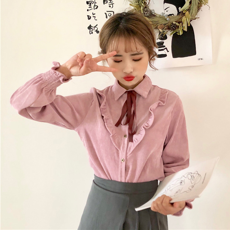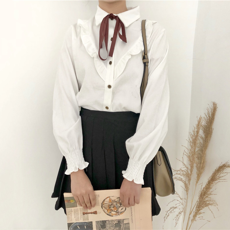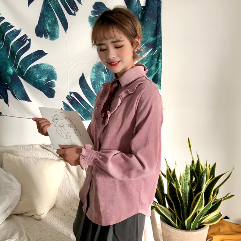 / 小清新燈芯絨蝴蝶結荷葉白襯衫女秋裝新款學院風學生寬松長袖上衣
