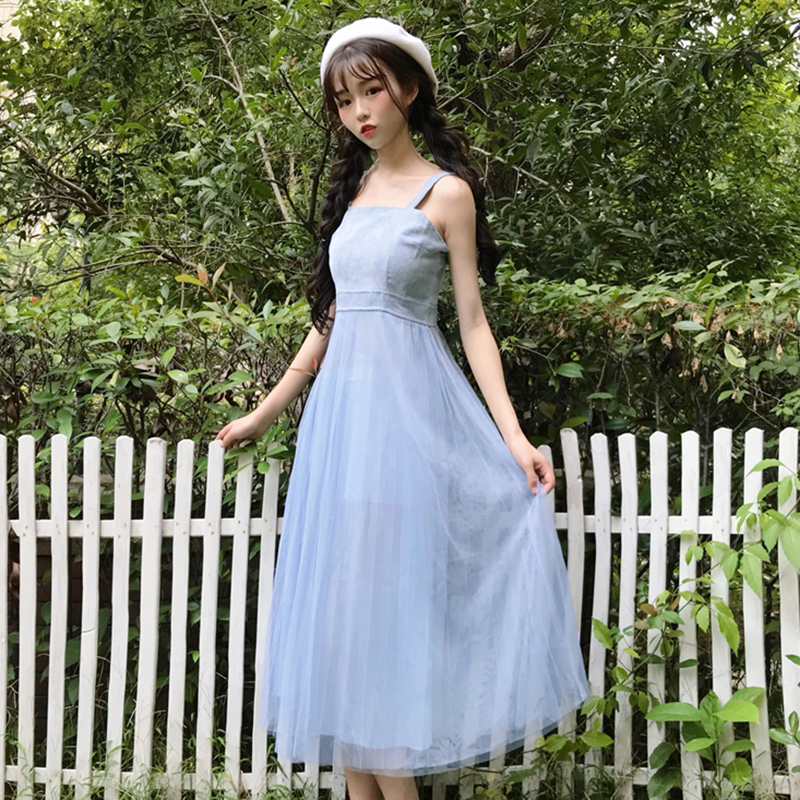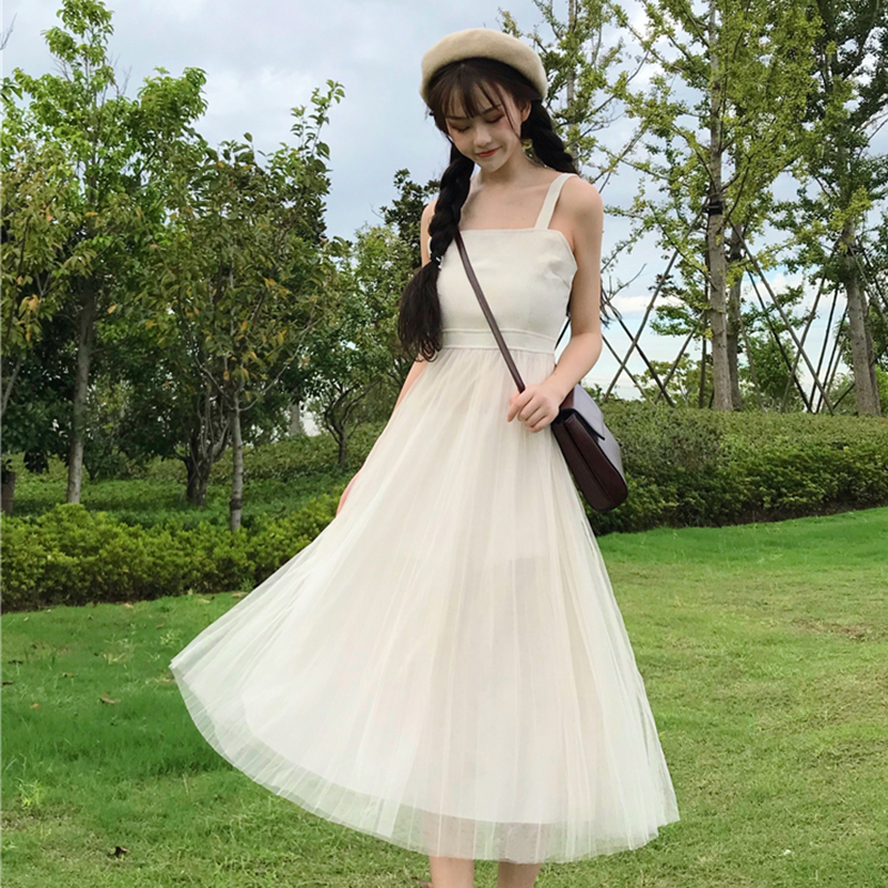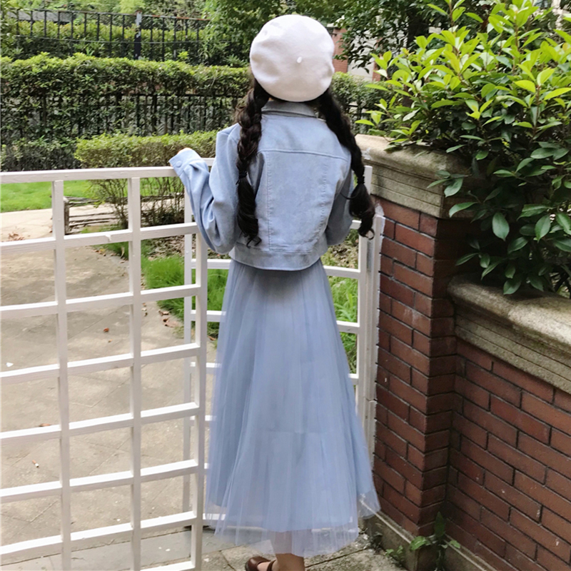 甜美兩件套秋裝女2018新款燈芯絨短外套拼接吊帶網紗中長連衣裙子