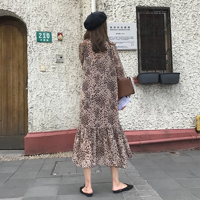 / 秋裝女2018新款港味氣質豹紋燈籠袖雪紡連衣裙荷葉邊中長裙子吊帶