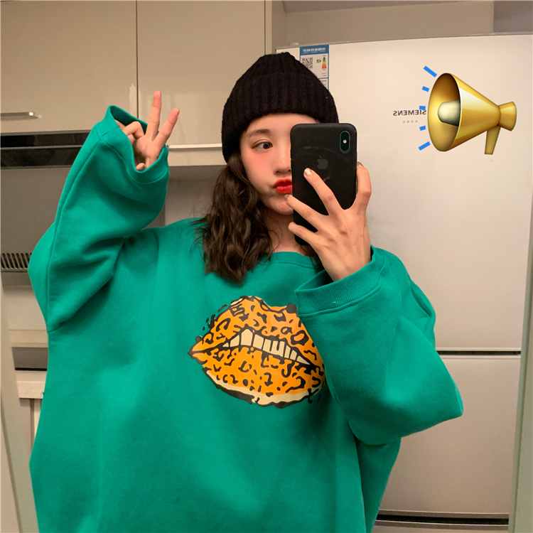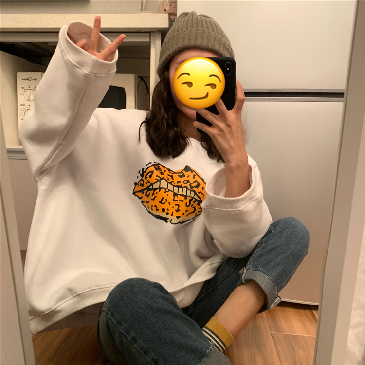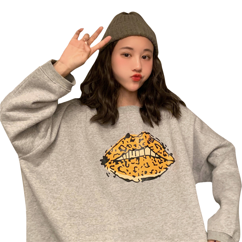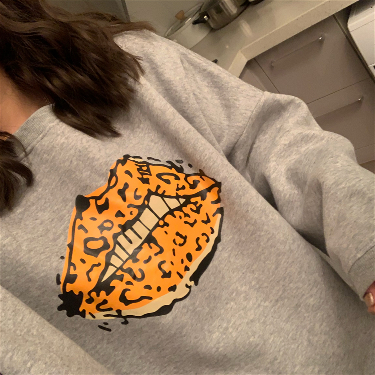 2018新款秋冬韓版原宿風寬松豹紋嘴唇加絨加厚套頭衛衣上衣外套女