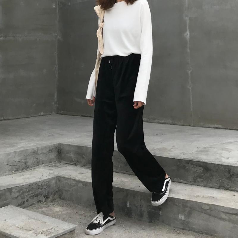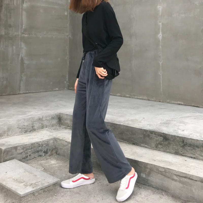 秋冬女裝2018新款韓版松緊高腰絲絨闊腿褲學生黑色寬松顯瘦長褲子