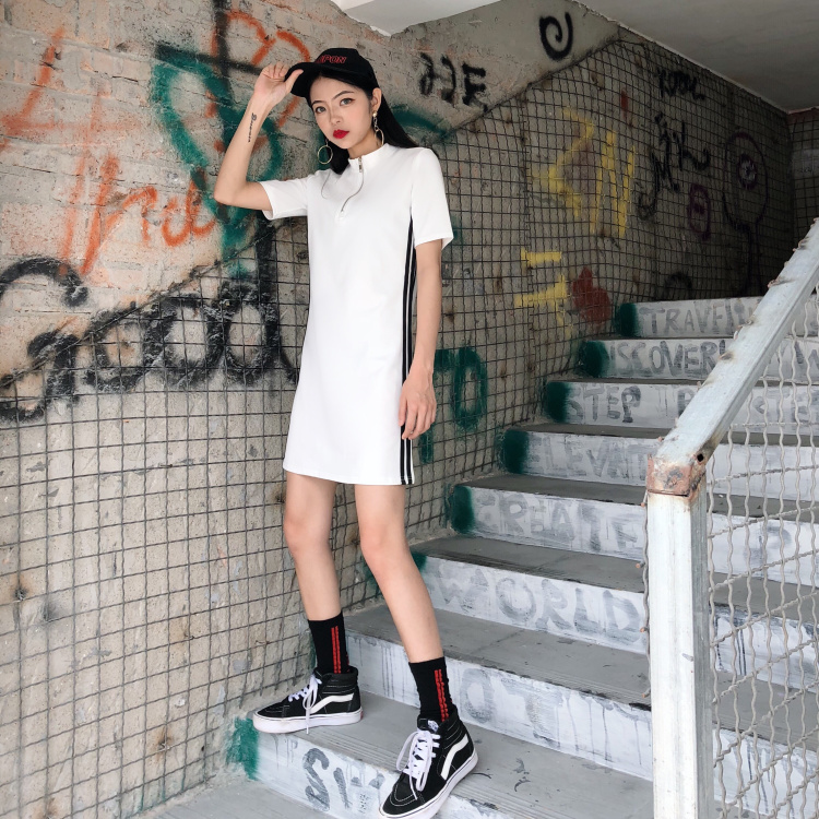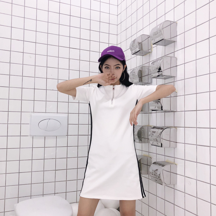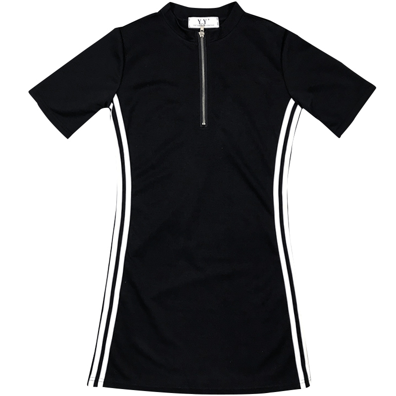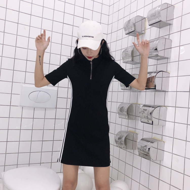 / 秋裝新款女裝撞色條紋收腰修身顯瘦學生休閑短袖打底包臀連衣裙女