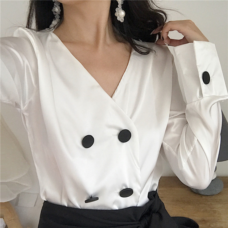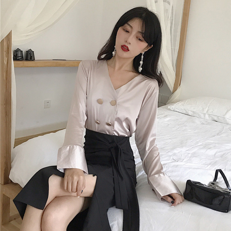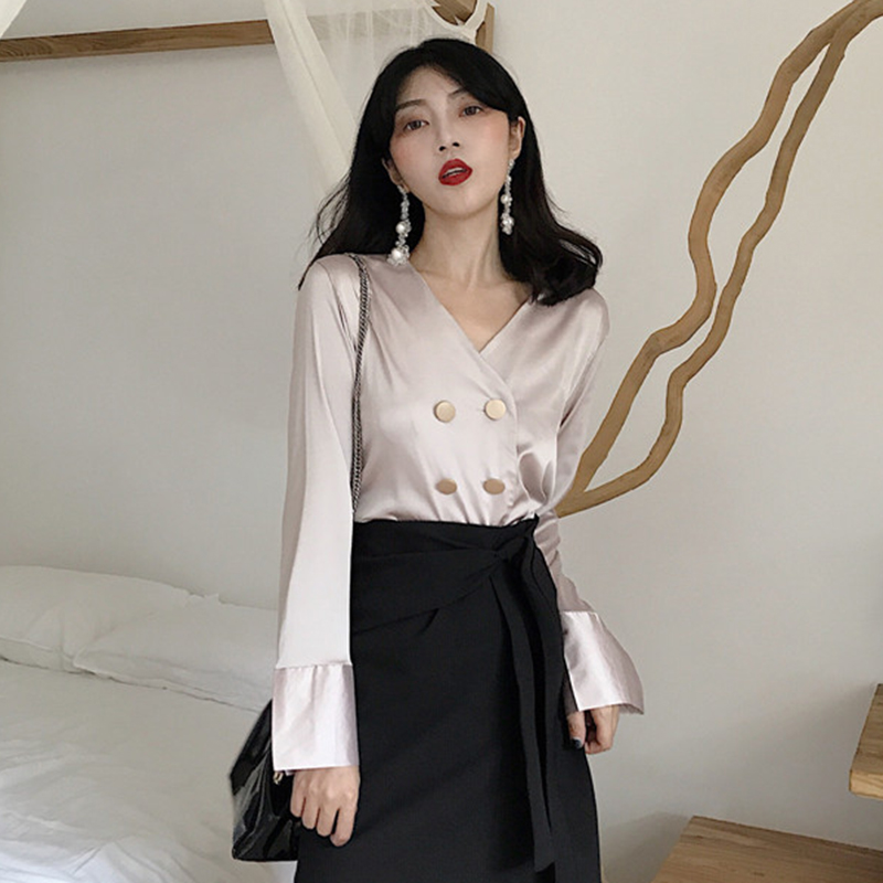 / 復古緞面雙排扣V領襯衣秋裝女2018新款修身氣質長袖襯衣休閑上衣
