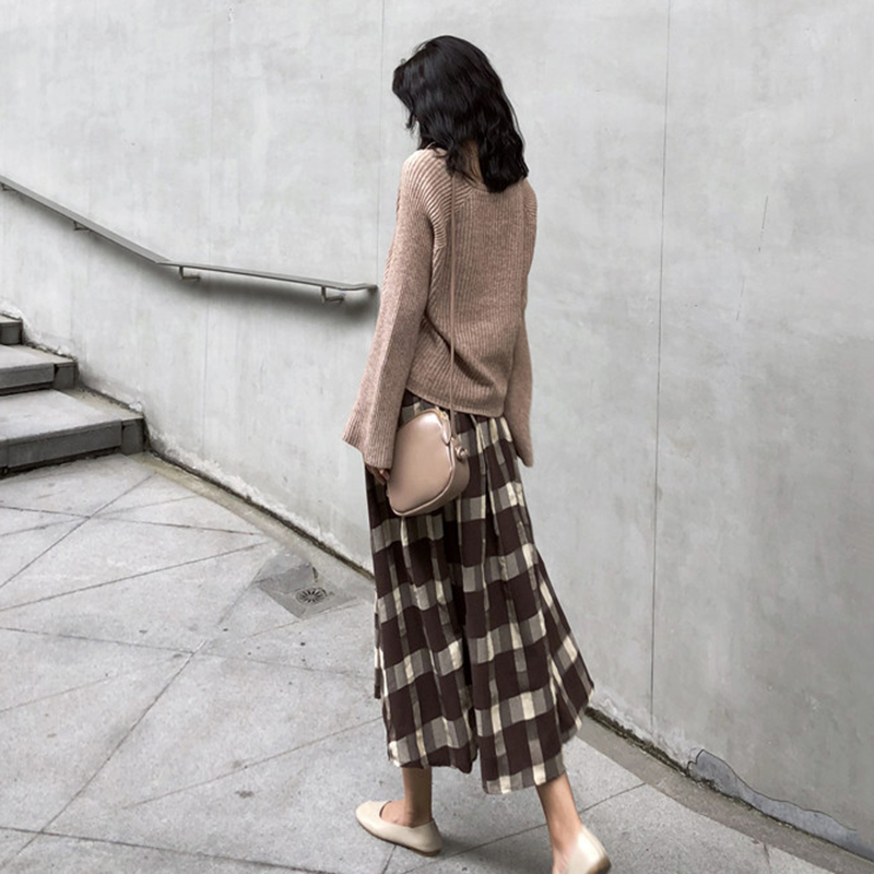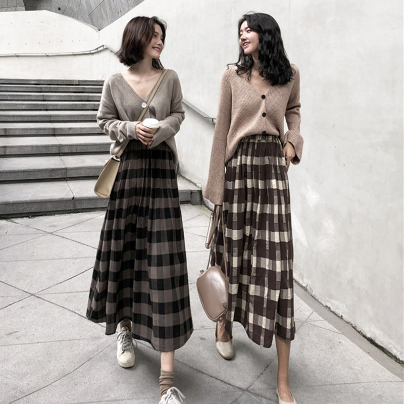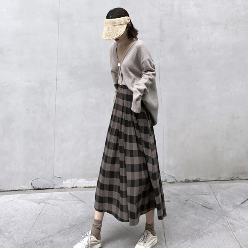 / 復古格子中長裙秋裝女2018新款學生松緊高腰半身裙時尚港味A字裙