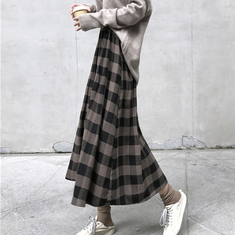 復古格子中長裙秋裝女2018新款學生松緊高腰半身裙時尚港味A字裙