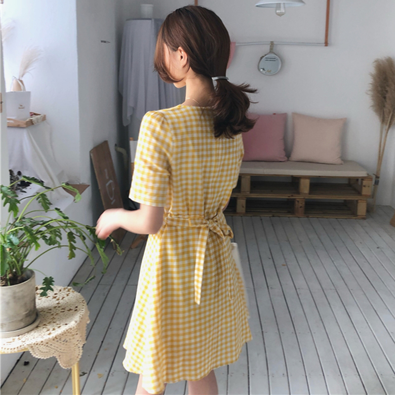 基礎的V領,腰部兩側有長長的帶子,隨意系上蝴蝶結即可收腰型