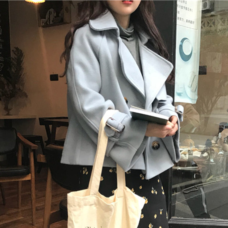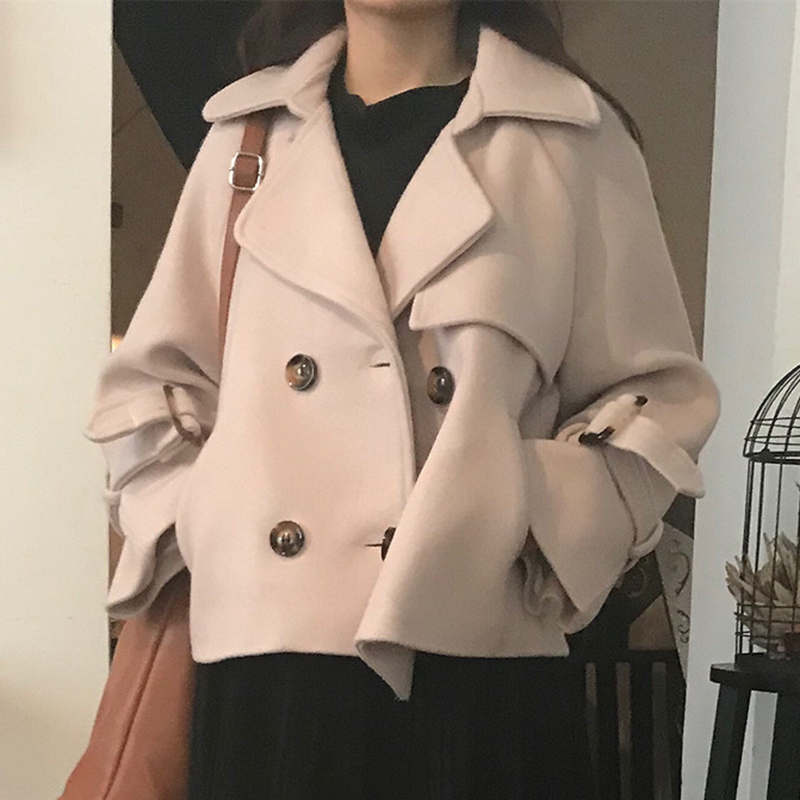 / 復古西裝領毛呢短外套秋冬女裝新款雙排扣呢大衣純色寬松長袖上衣