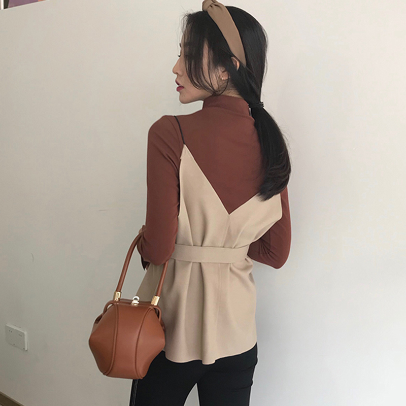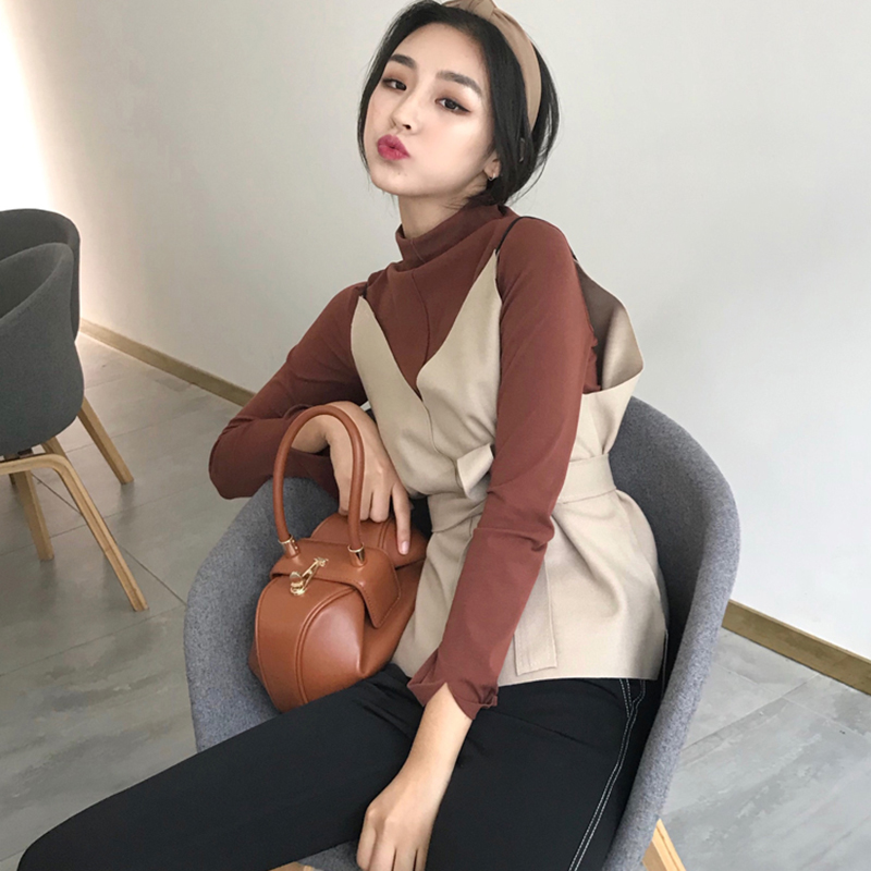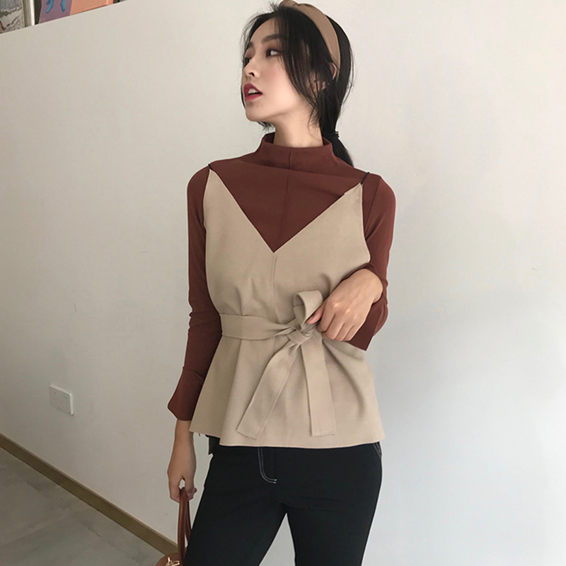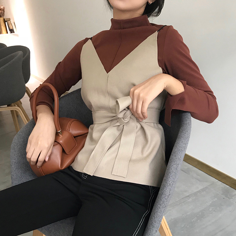 / 兩件套早秋新款修身小高領開叉長袖打底衫T恤+V領綁帶吊帶馬甲女