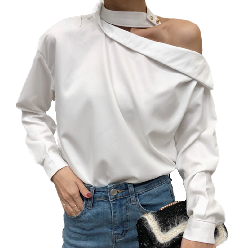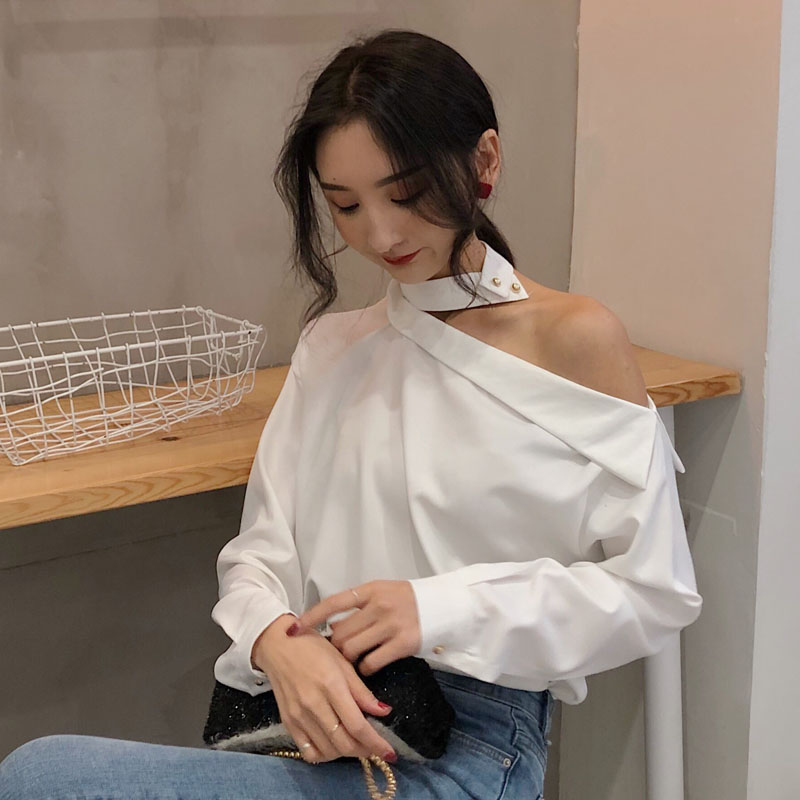 / 春裝新款女裝韓版復古掛脖斜肩長袖襯衫氣質寬松顯瘦露肩白襯衣女