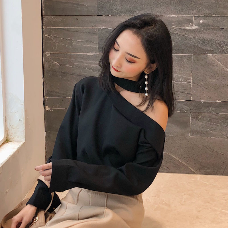 春裝新款女裝韓版復古掛脖斜肩長袖襯衫氣質寬松顯瘦露肩白襯衣女