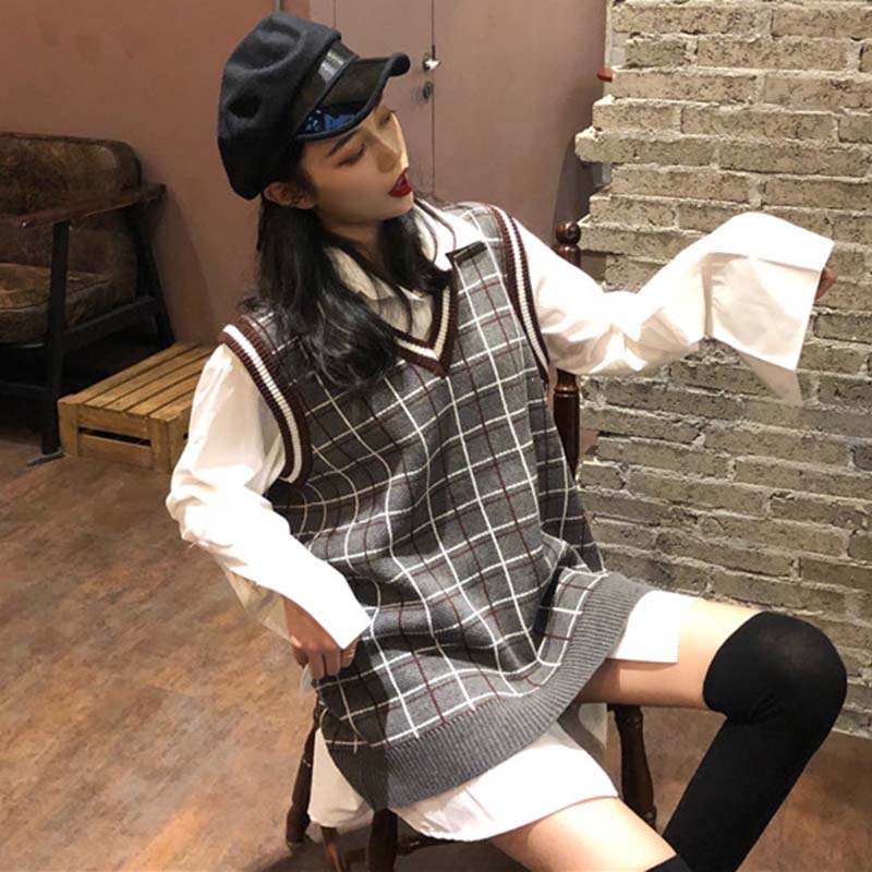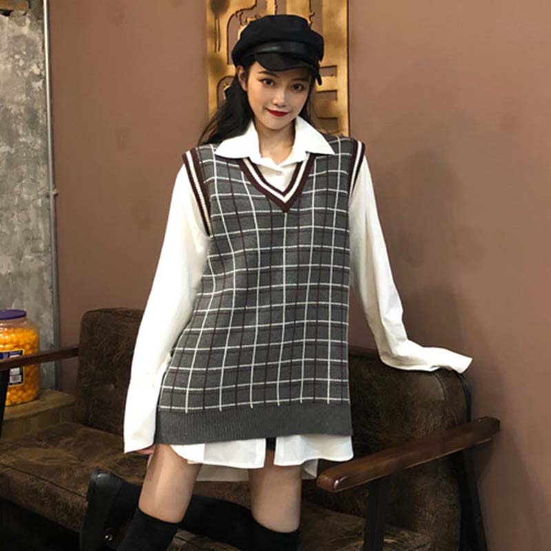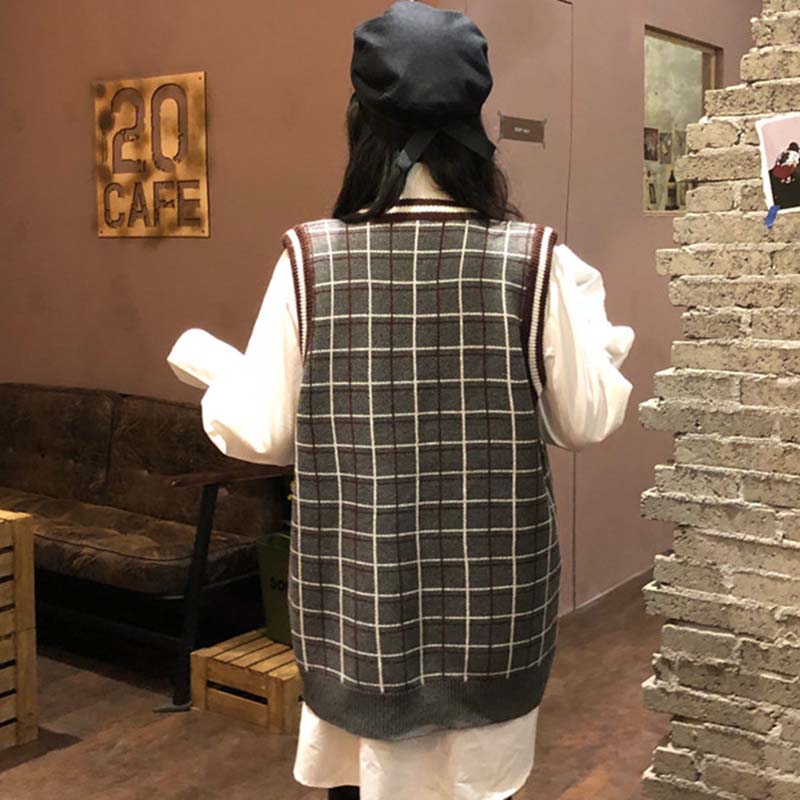 / 學院風格子針織衫秋裝女2018新款韓版學生寬松中長款馬甲背心上衣