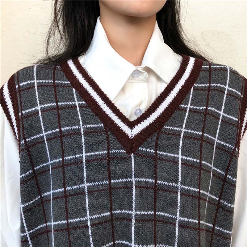 學院風格子針織衫秋裝女2018新款韓版學生寬松中長款馬甲背心上衣