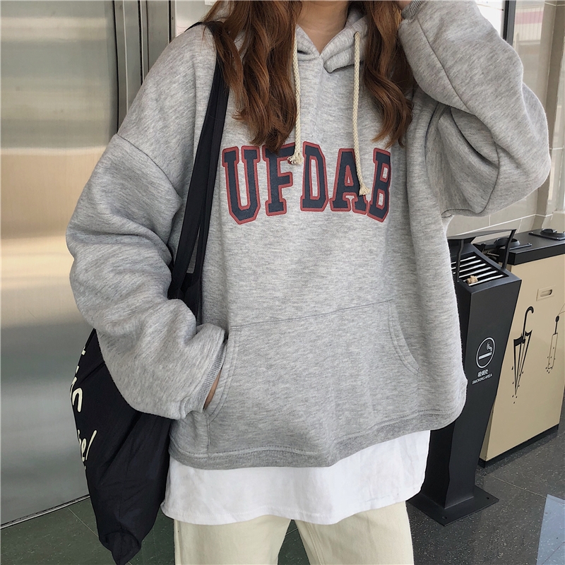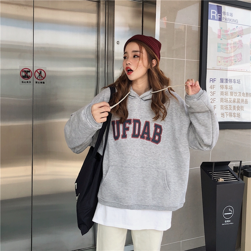 2018新款秋冬韓版復古慵懶風寬松字母連帽加絨加厚衛衣上衣外套女