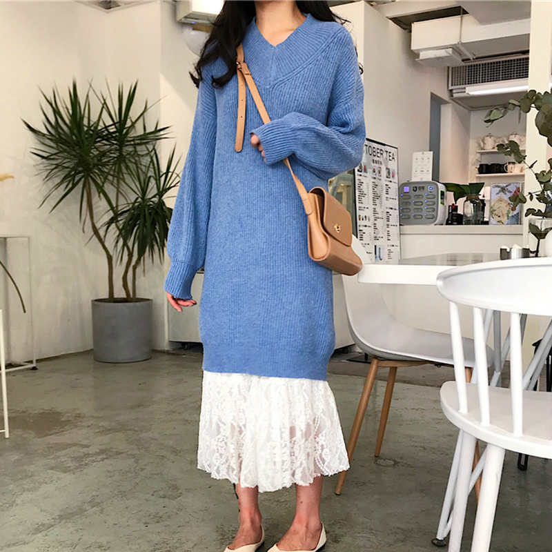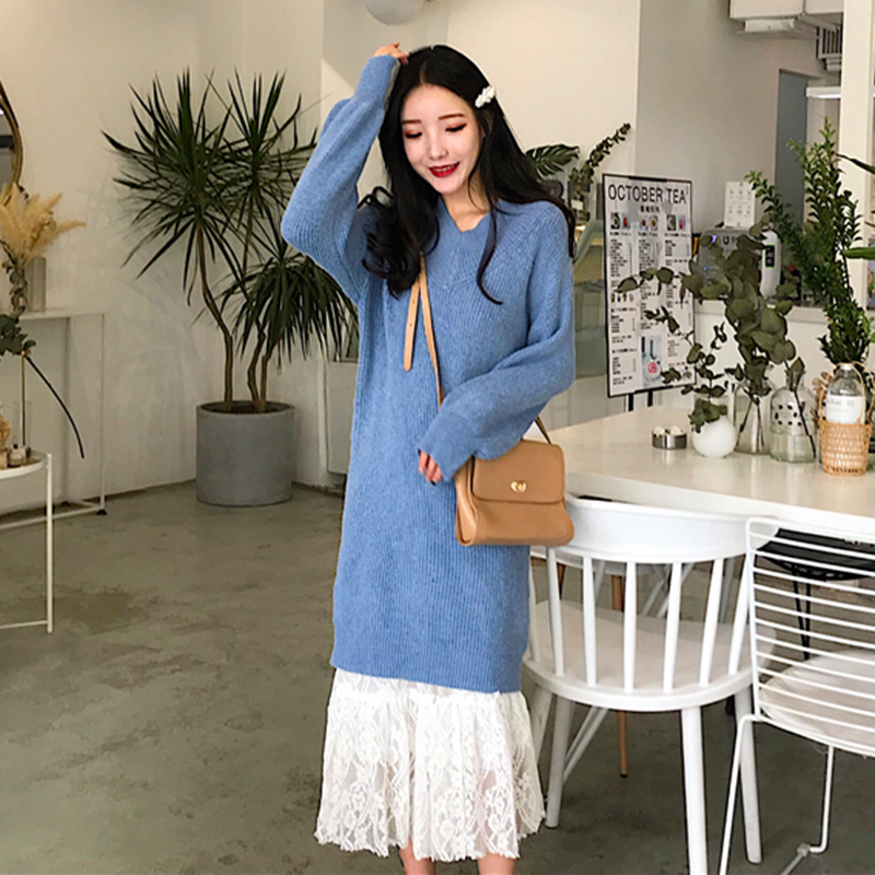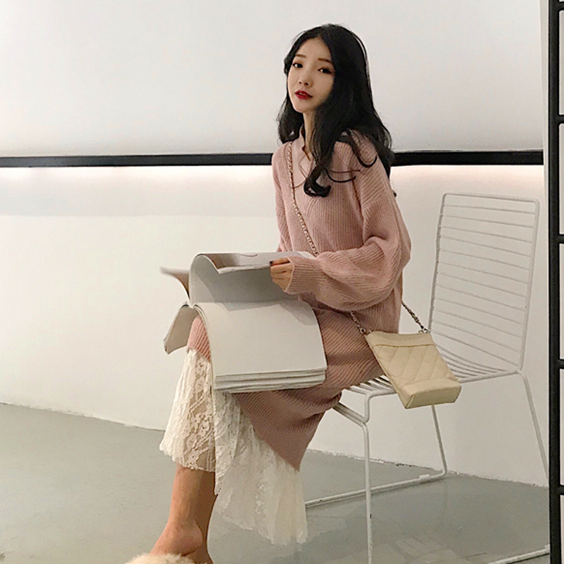 溫柔風套裝女秋2018新款中長款針織衫長袖毛衣仙氣質蕾絲半身裙子