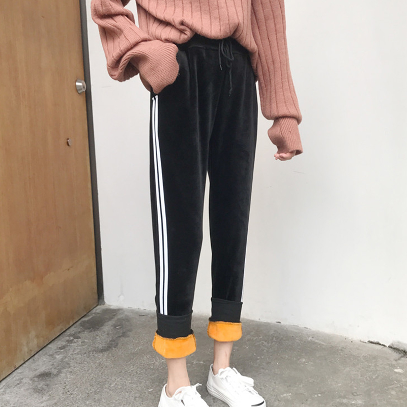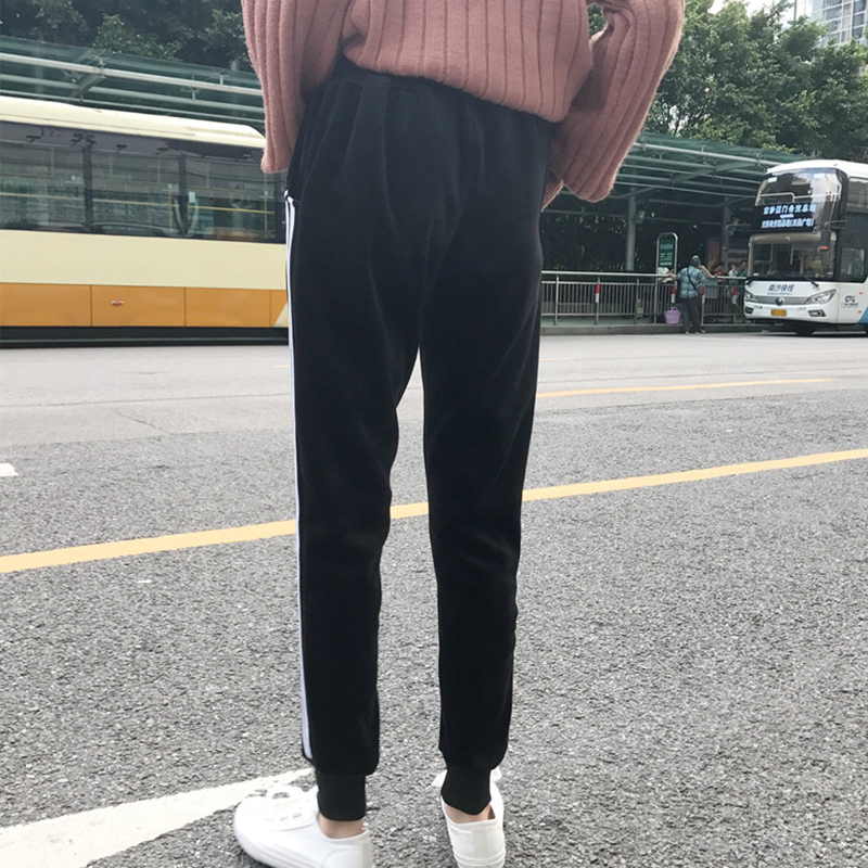 / 秋裝女2018新款側邊條紋束腳哈倫褲高腰絲絨保暖休閑運動長褲子潮
