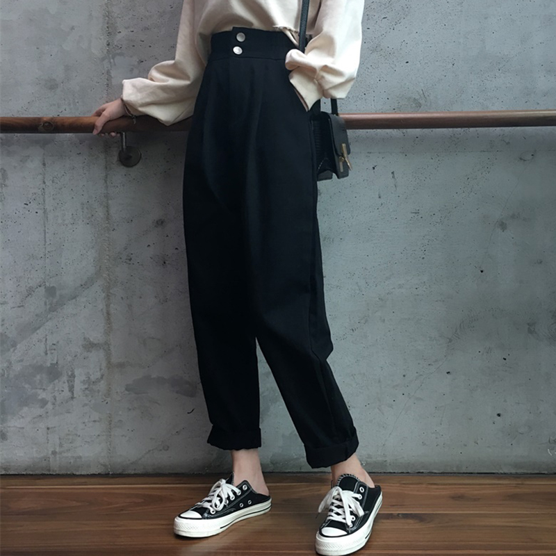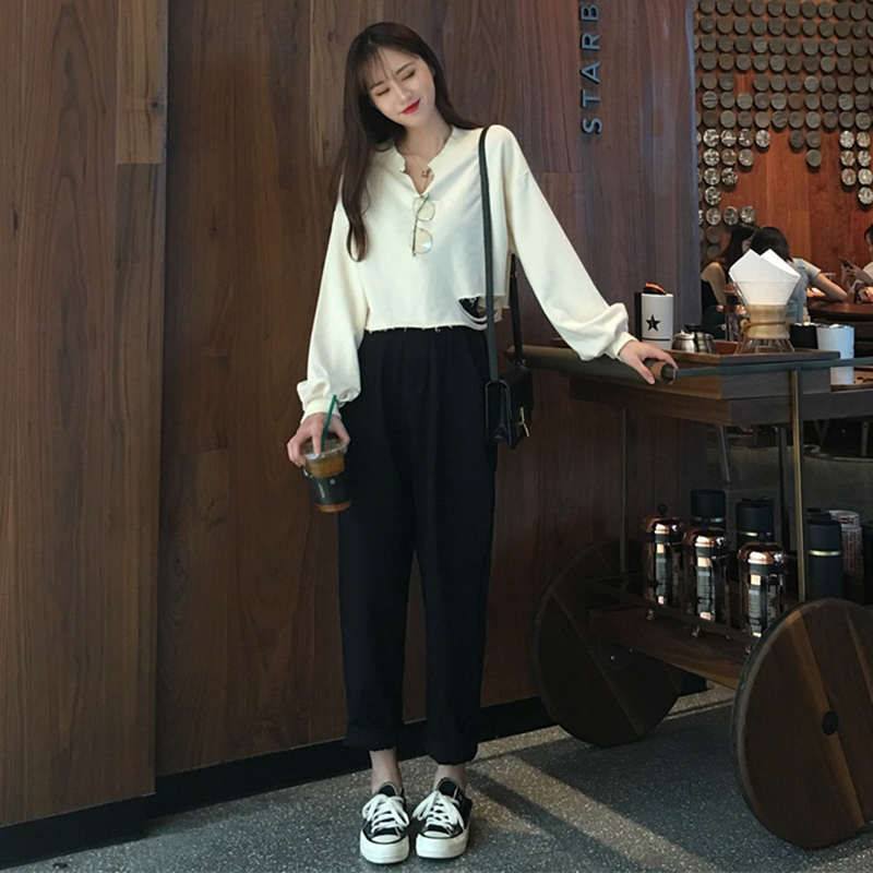 / 休閑套裝女秋季新款韓版寬松V領破洞短款長袖衛衣高腰哈倫長褲子