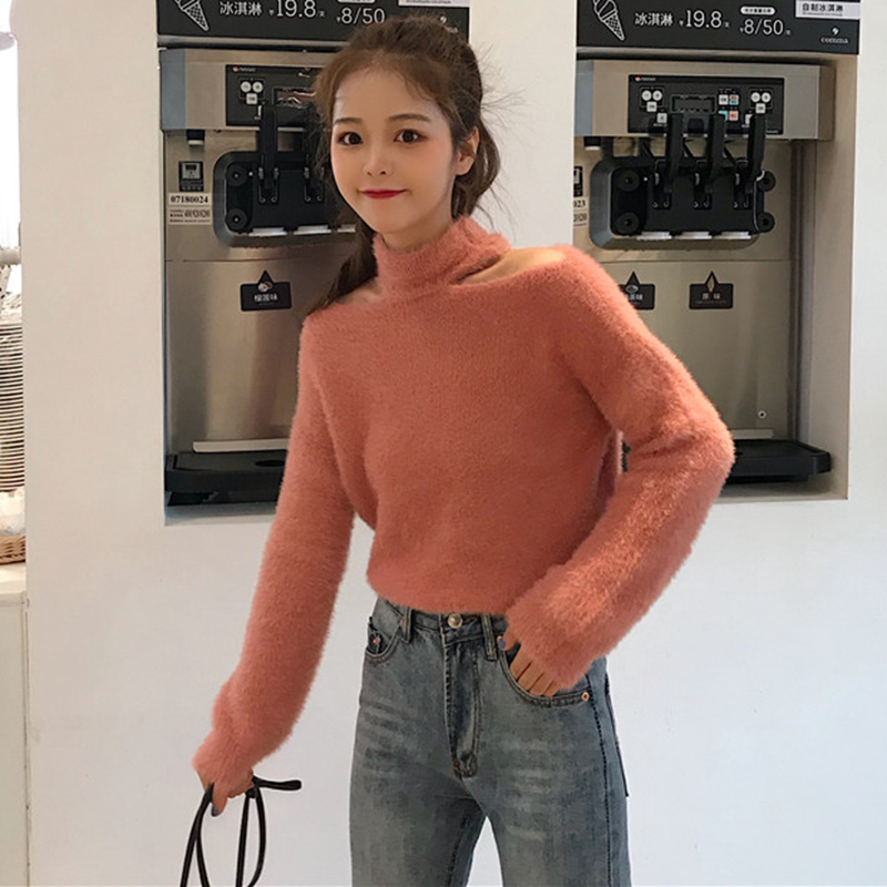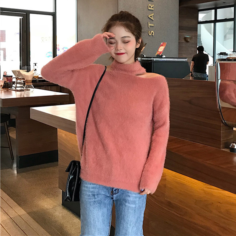 / 慵懶風露肩掛脖套頭毛衣秋冬新款女裝休閑寬松純色毛絨絨長袖外套