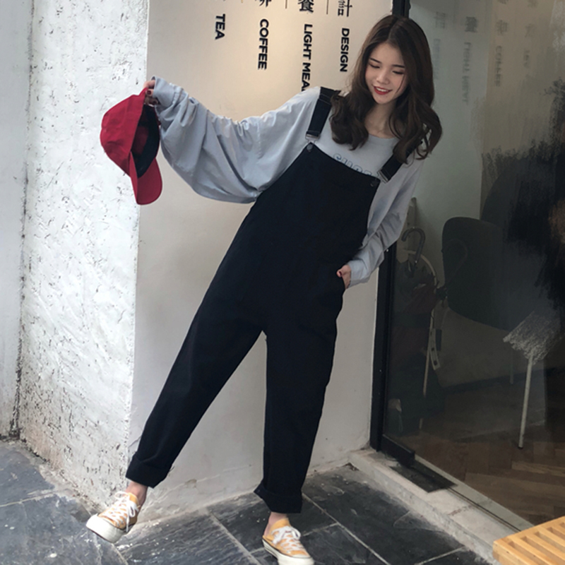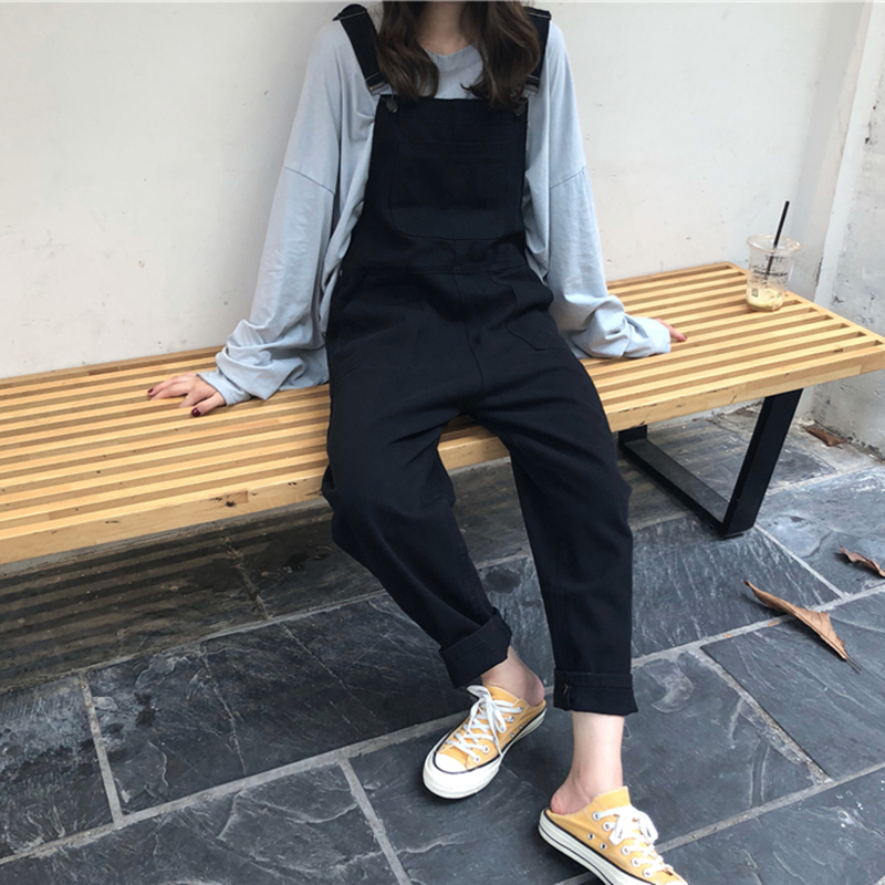 / 女秋裝新款復古做舊口袋牛仔背帶褲學生寬松顯瘦黑色吊帶連體褲子