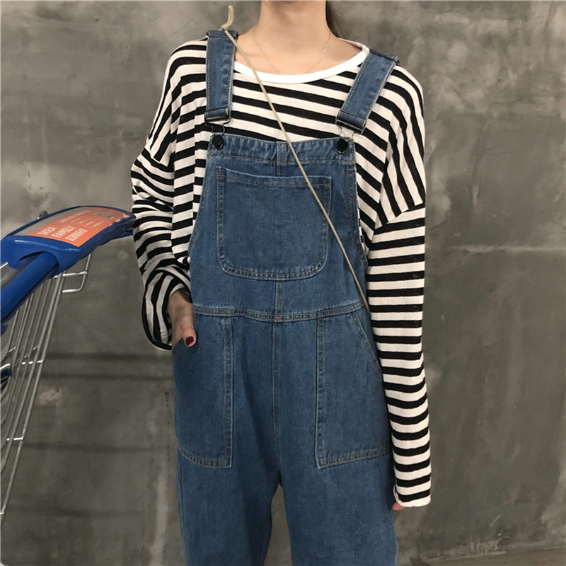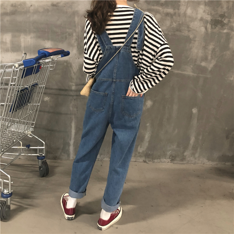 女秋裝新款復古做舊口袋牛仔背帶褲學生寬松顯瘦黑色吊帶連體褲子
