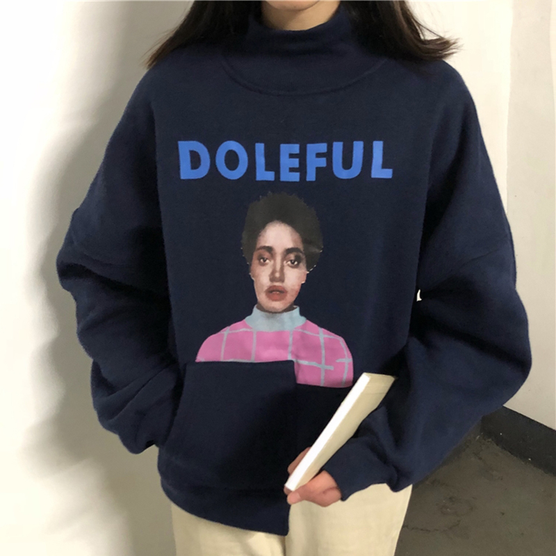 / 秋冬女裝新款字母印花半高領加絨衛衣學生不規則寬松長袖外套上衣