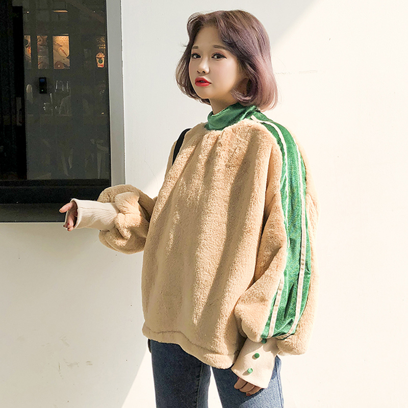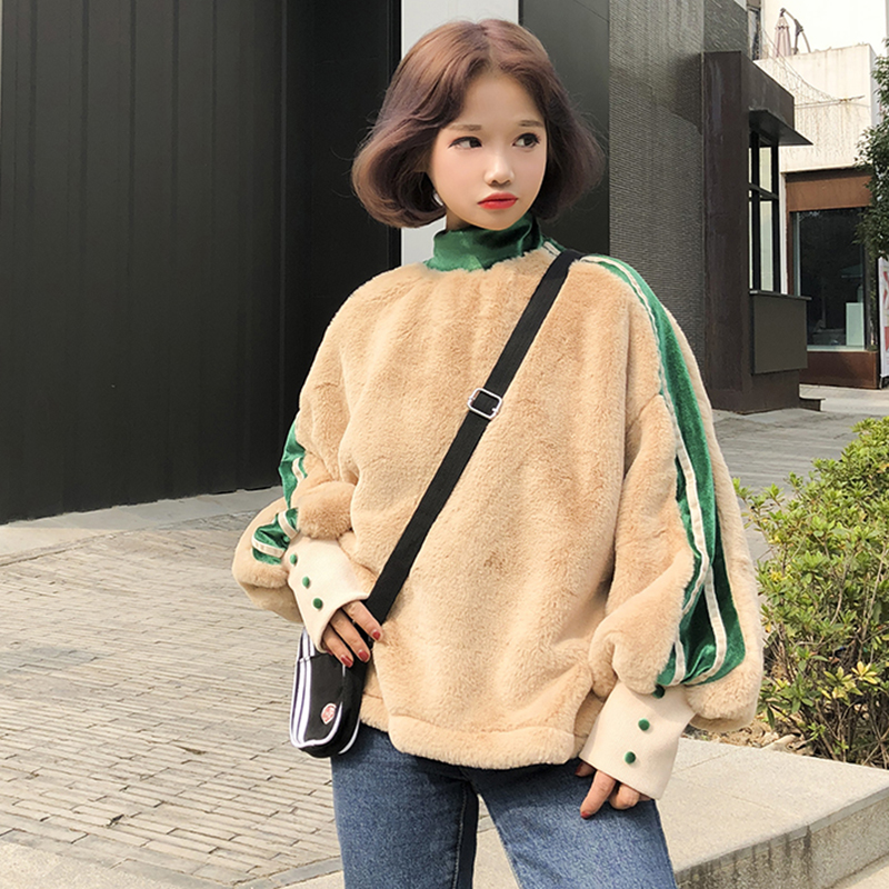/ 時尚拼接條紋毛絨絨上衣秋冬女裝新款寬松燈籠長袖衛衣小高領外套