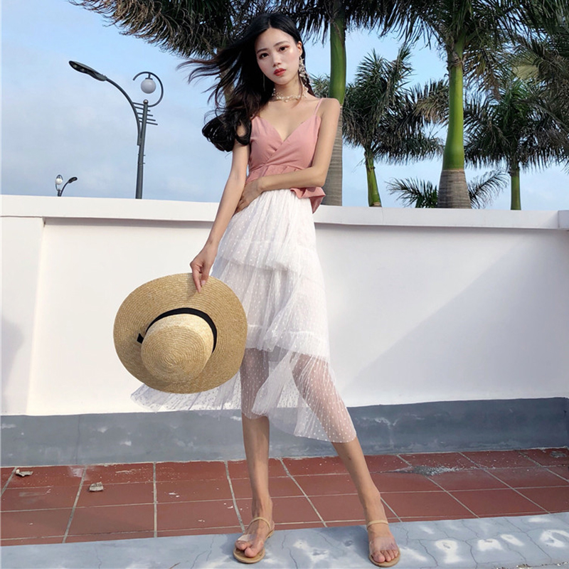 夏季新款女裝荷葉邊吊帶背心+高腰顯瘦網紗蛋糕半身裙學生套裝女