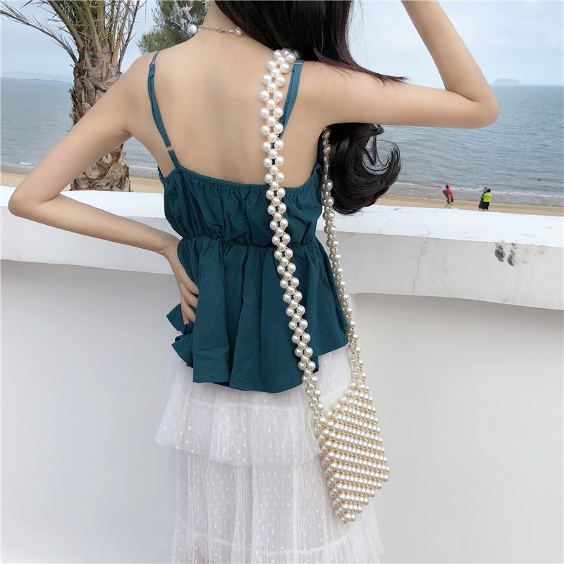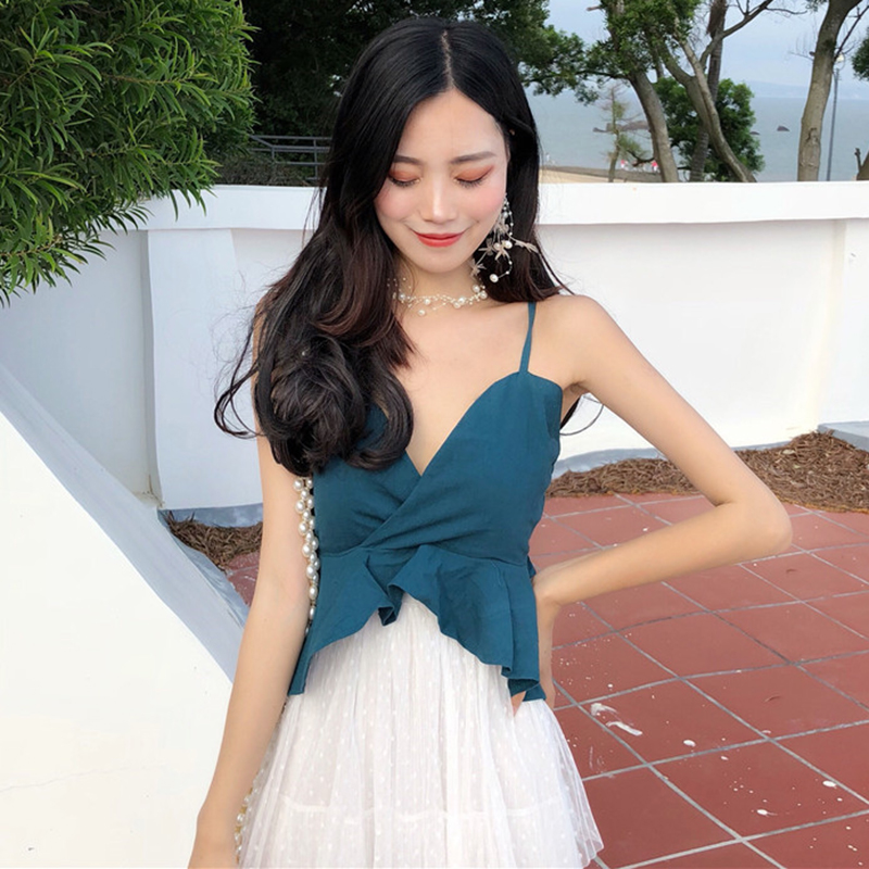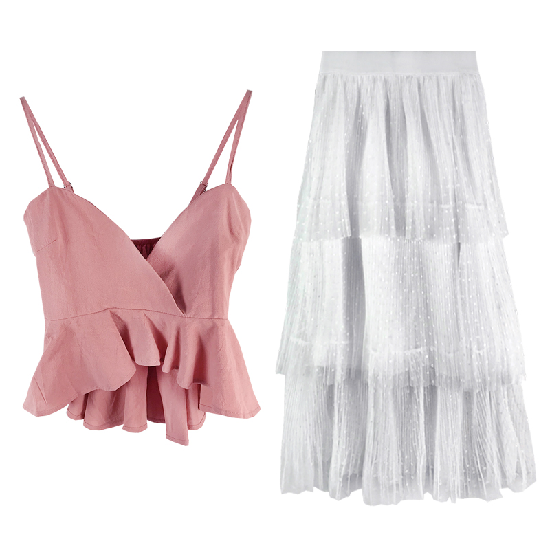 / 夏季新款女裝荷葉邊吊帶背心+高腰顯瘦網紗蛋糕半身裙學生套裝女