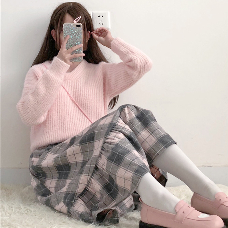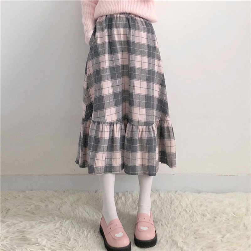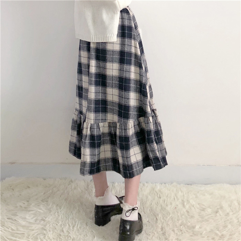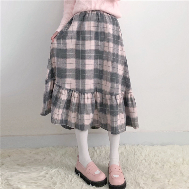 / 半身裙女秋裝2018新款毛呢格子a字裙顯瘦松緊高腰荷葉邊中長裙子