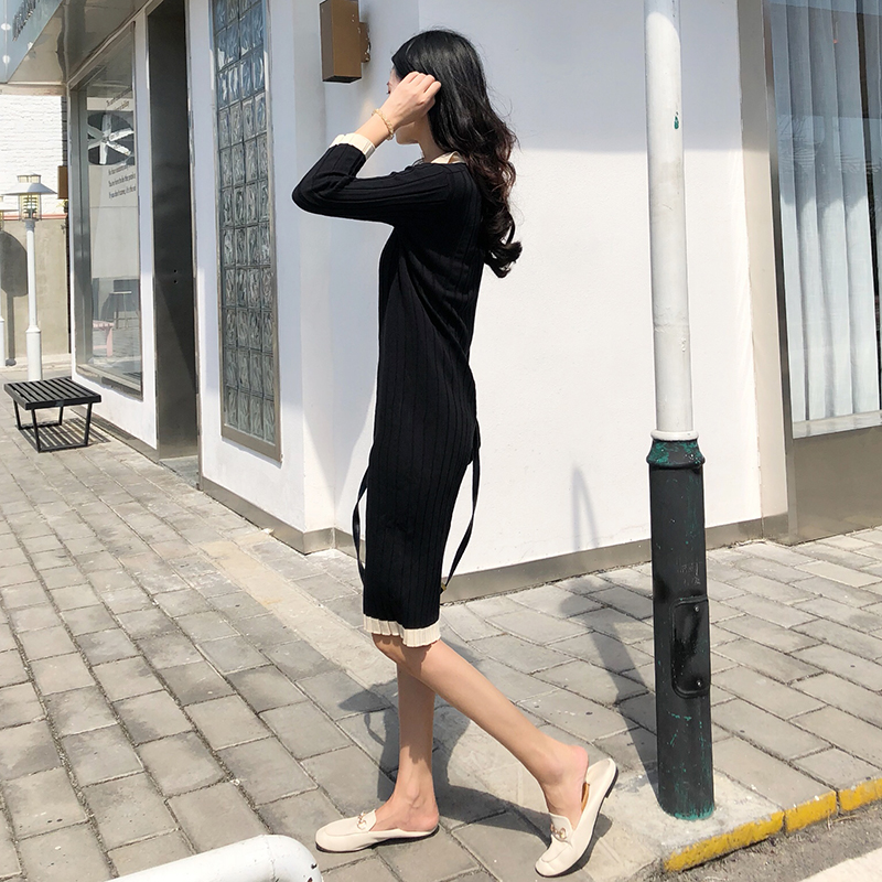 Polo領中長款裙子女冬裝2018新款韓版氣質修身黑色顯瘦針織連衣裙