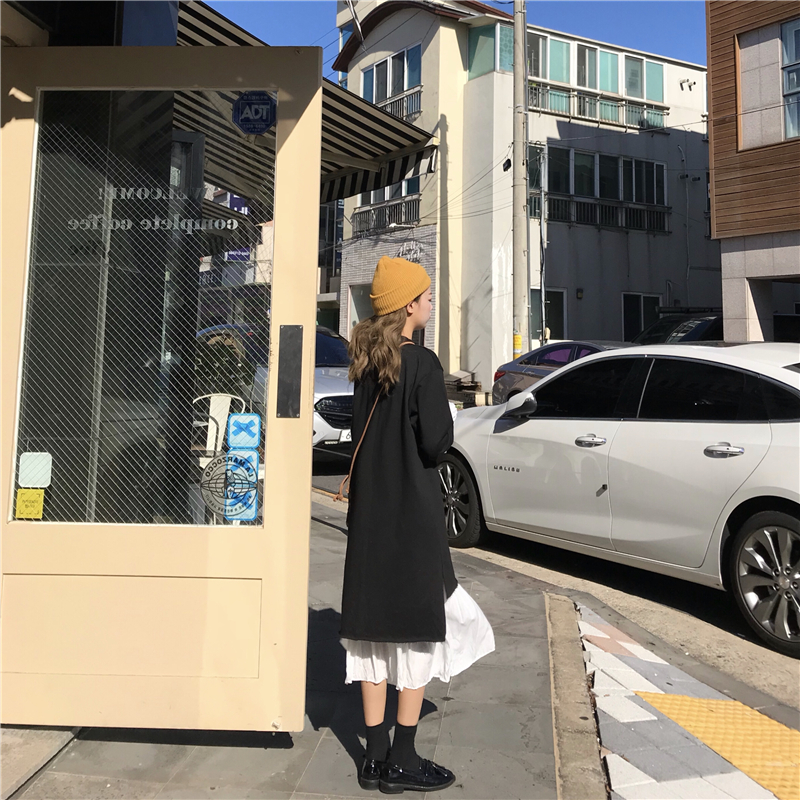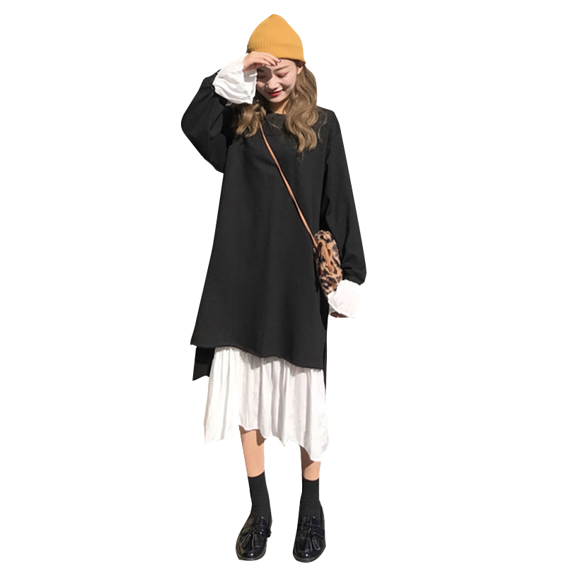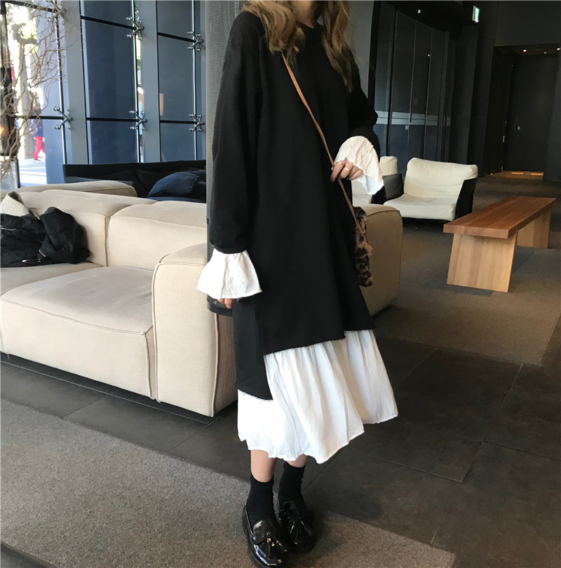 / 秋冬女裝韓版氣質中長款不規則裙子拼接喇叭袖連衣裙+吊帶打底裙