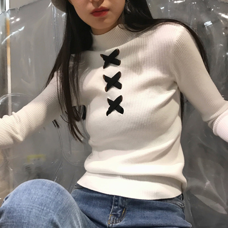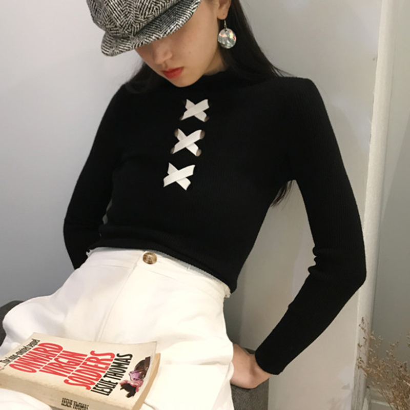 / 黑色半高領打底衫女秋冬 長袖 緊身上衣女針織衫修身交叉白色毛衣
