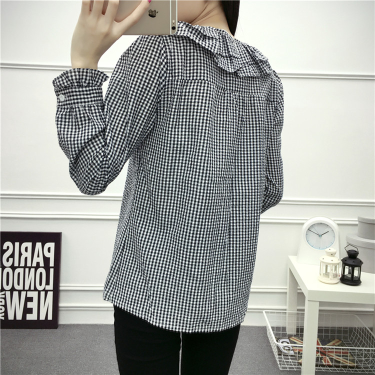 / 早春新款女裝娃娃領格子荷葉邊長袖寬松顯瘦學院風襯衫襯衣上衣女