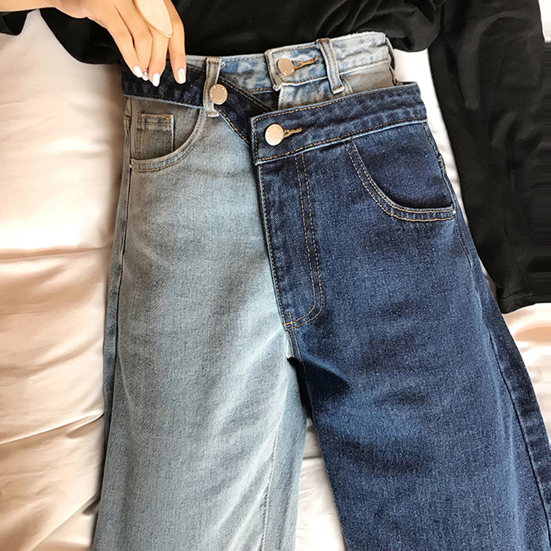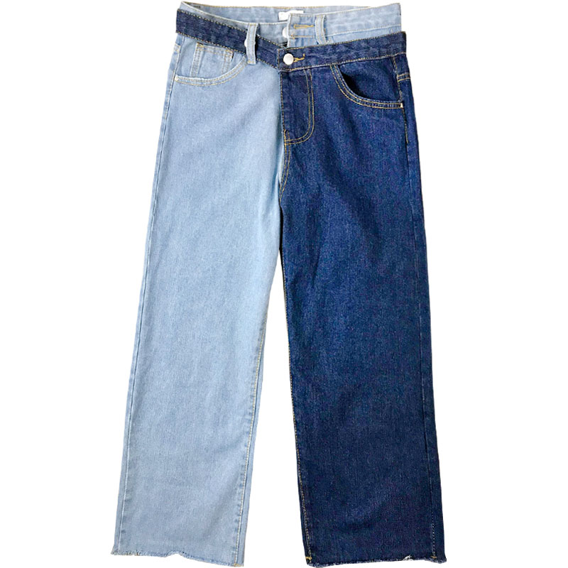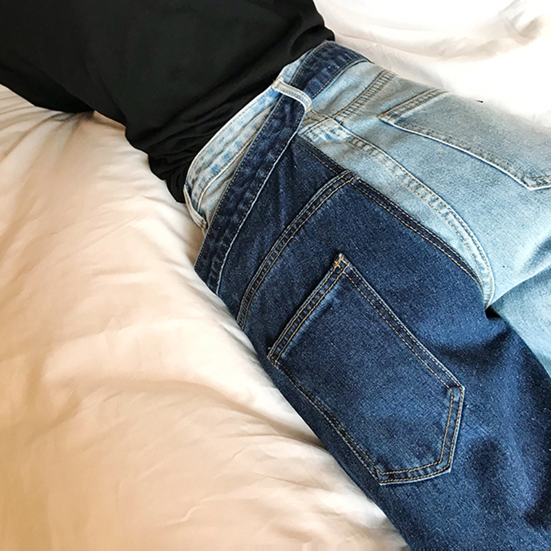牛仔褲女夏2018新款女裝寬松復古拼色九分褲韓版顯瘦高腰闊腿褲子