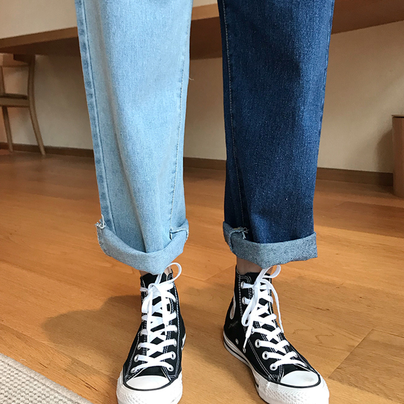 / 牛仔褲女夏2018新款女裝寬松復古拼色九分褲韓版顯瘦高腰闊腿褲子