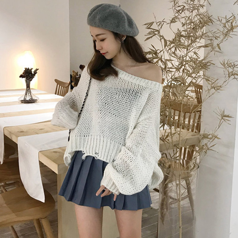 / 時尚鏤空慵懶毛衣秋裝女2018新款圓領寬松長袖上衣學生休閑針織衫