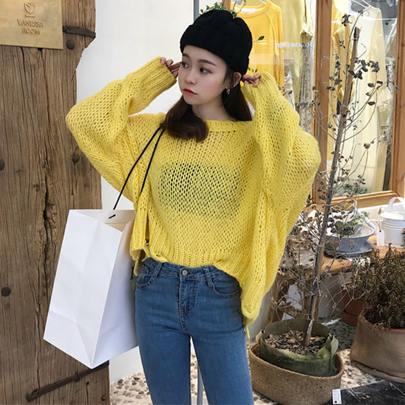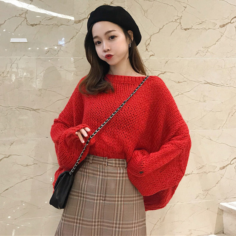 時尚鏤空慵懶毛衣秋裝女2018新款圓領寬松長袖上衣學生休閑針織衫